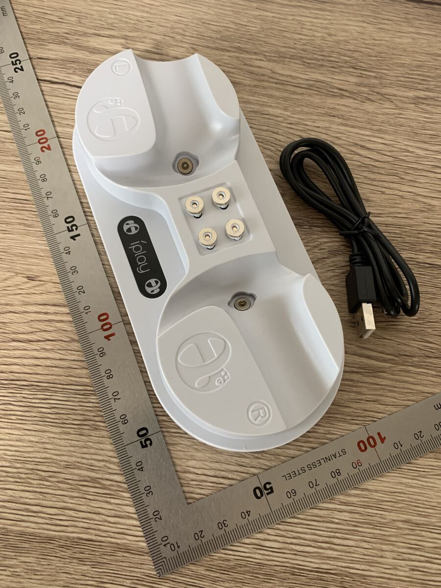 を充電スタンドに置き、家庭用のコンセントに接続すれば、PS5機体に邪魔ならず、VRタッチコントローラーを2つ同時に充電することができます。