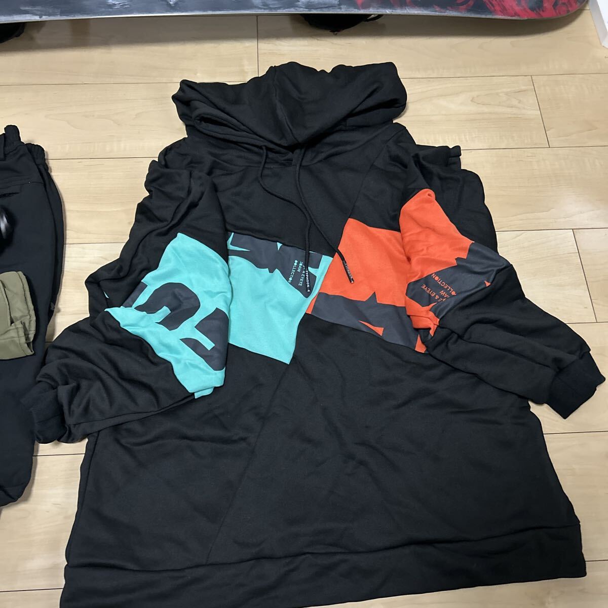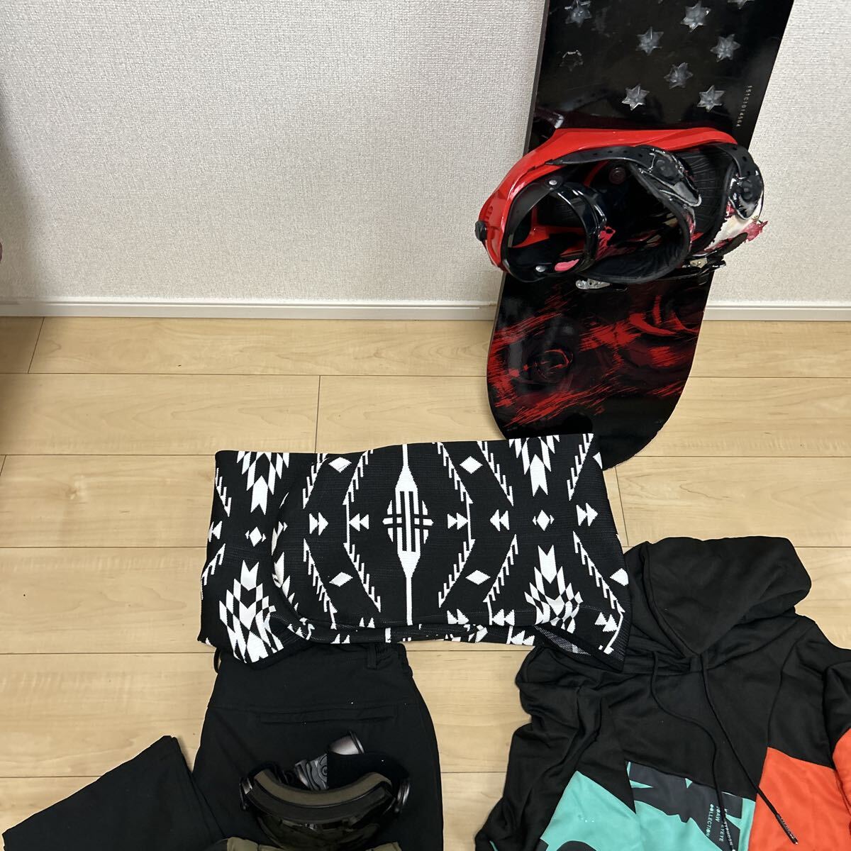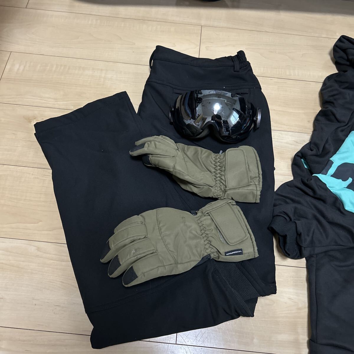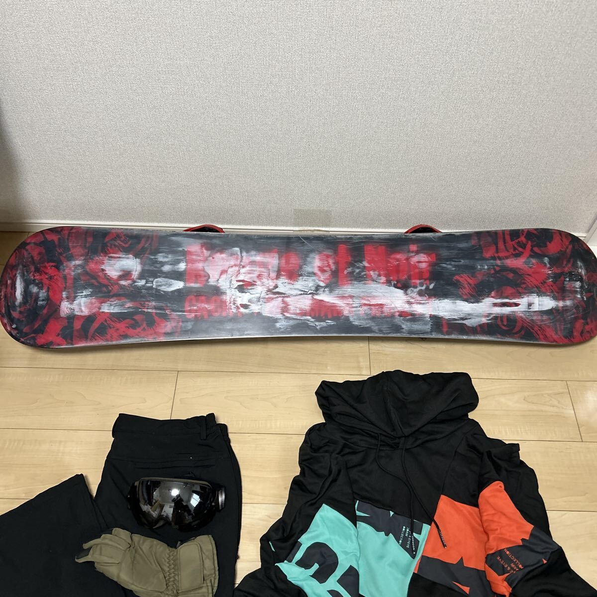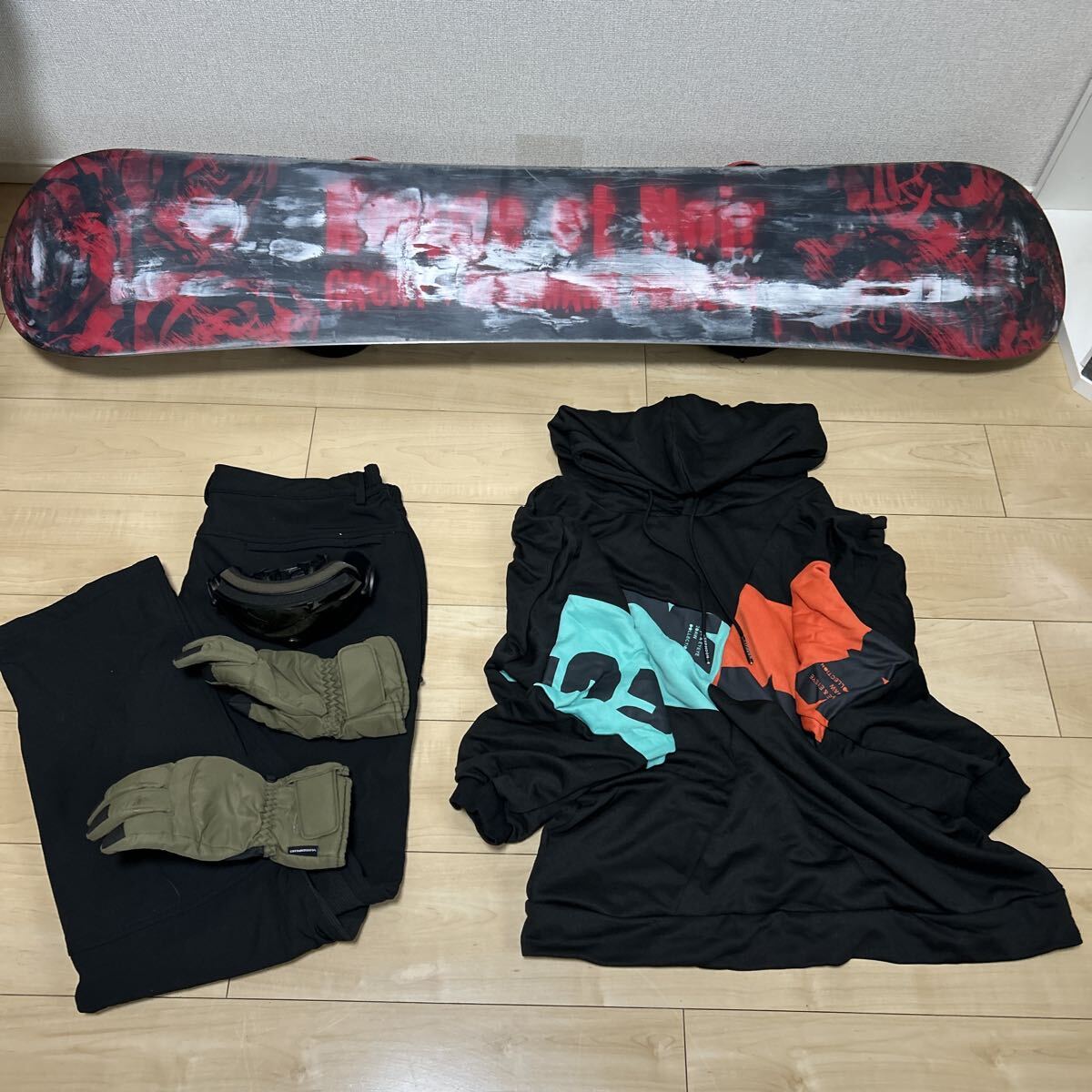 ゴ-グルと手袋とウエア上下はセットでお付けいましたます。大変お買い得になりますのでこれからスノボーシーズンに入りますのでどうでしょうか。裏の白いのは滑りやすくする為にロウを塗っておりますので白くなっております。発送前には綺麗にして発送致しますので宜しくお願い致します。