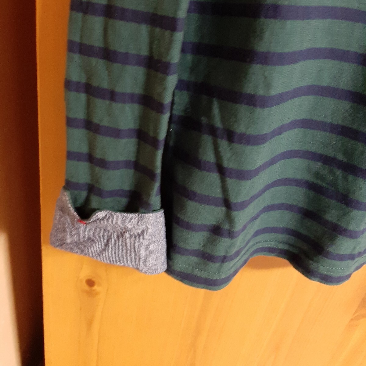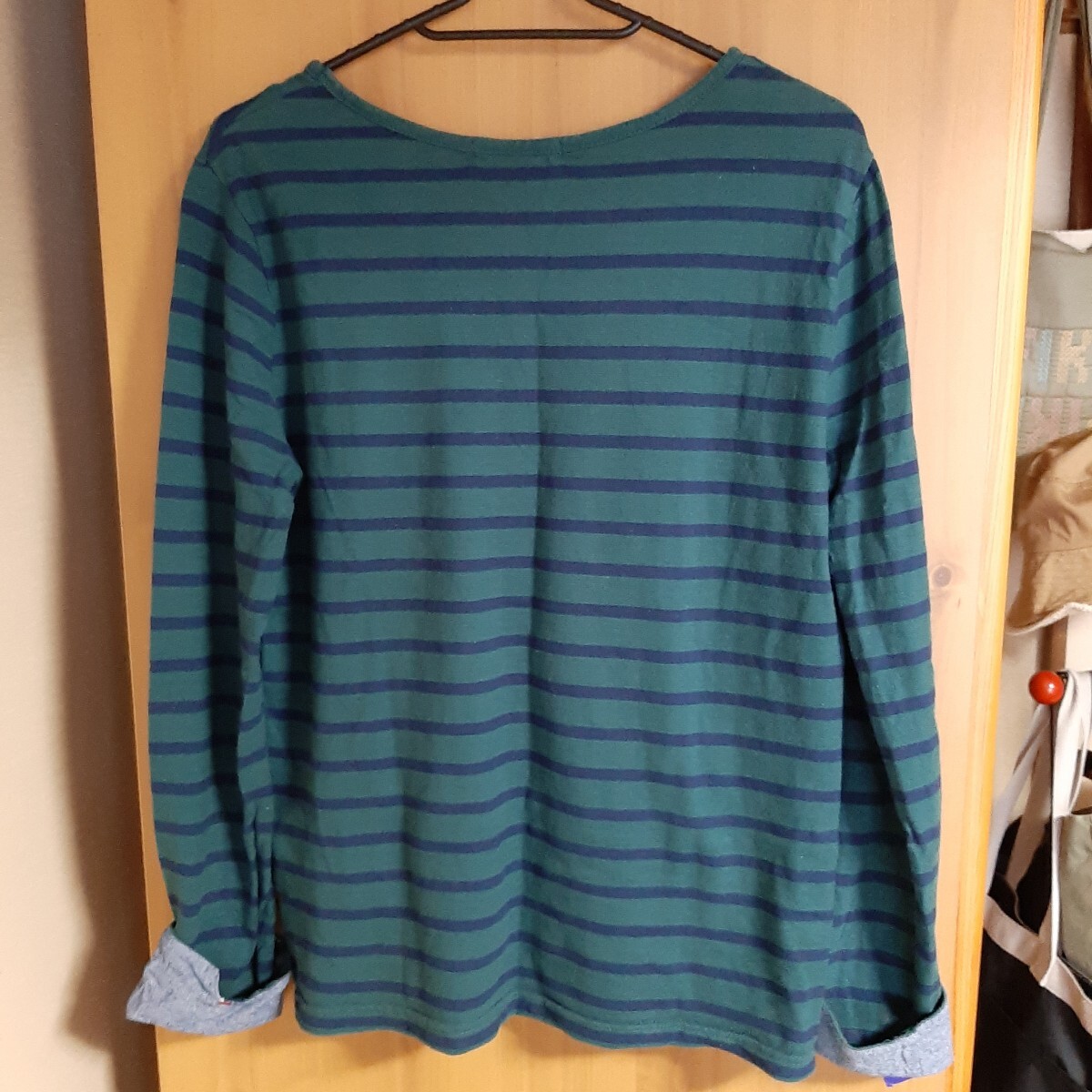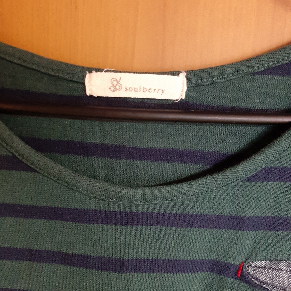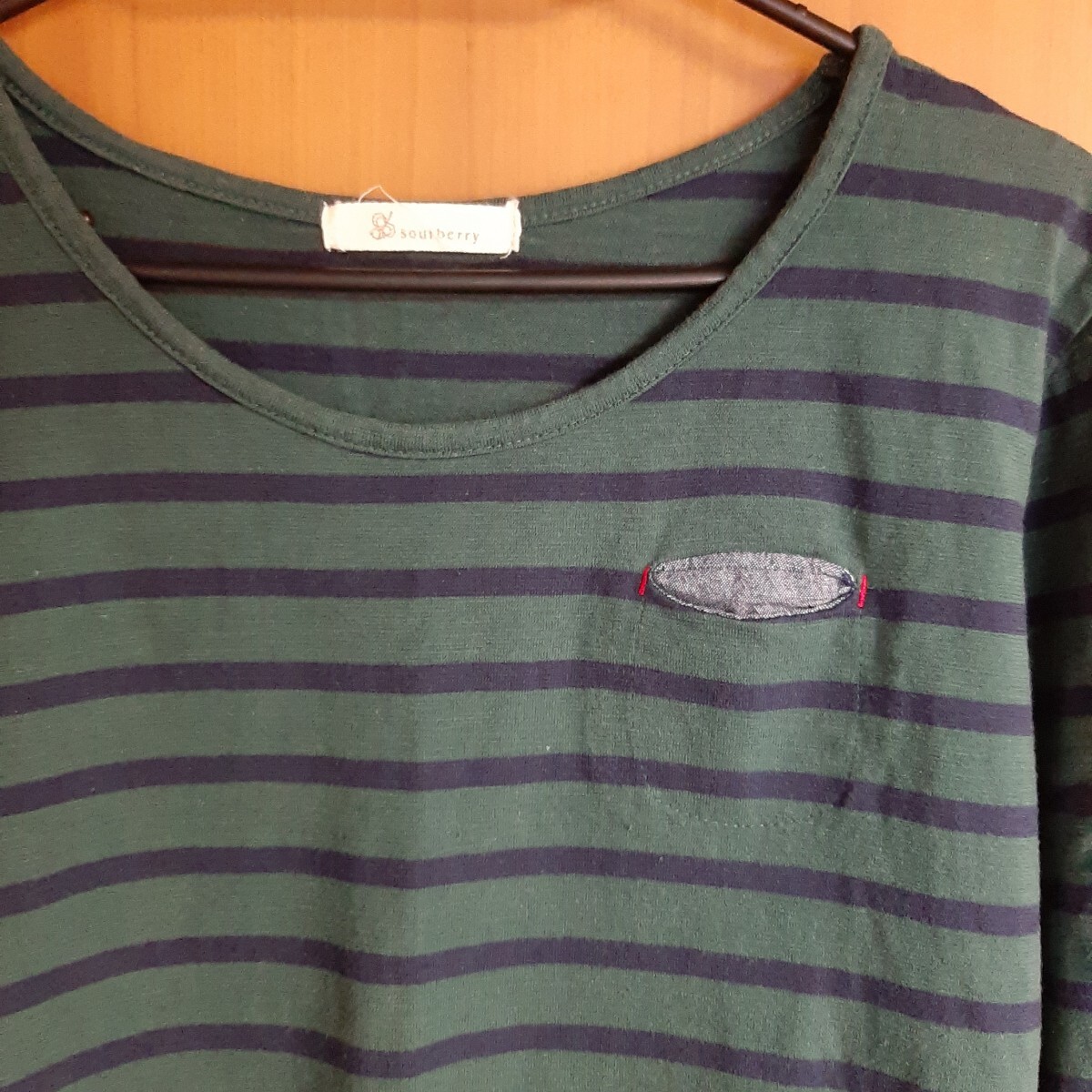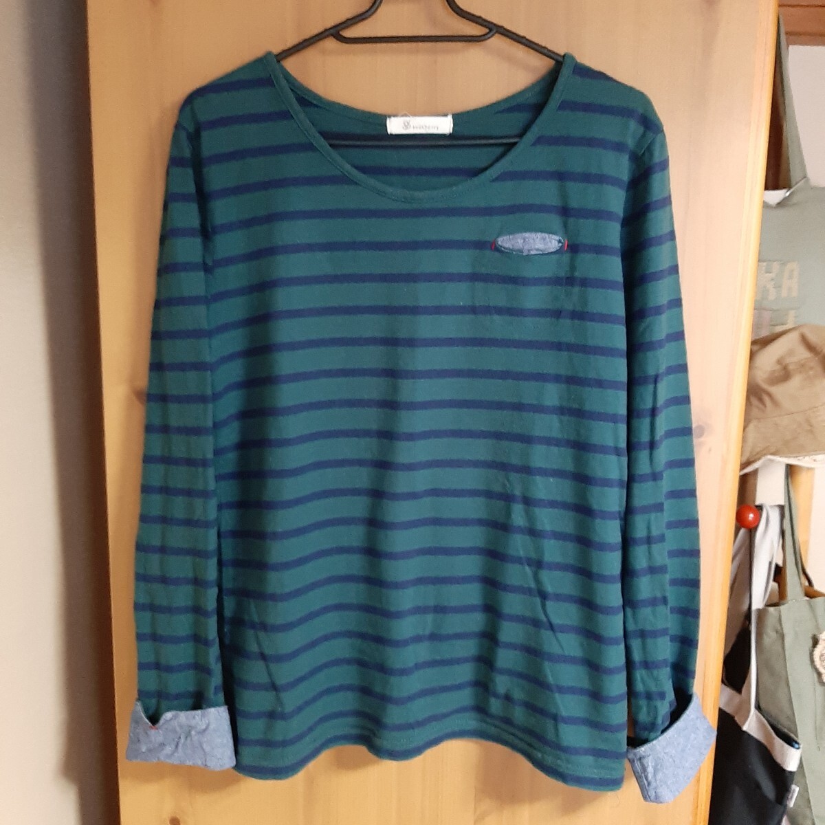 ソウルベリーの緑と紺のボーダー、ロールアップ袖の長袖Tシャツ。