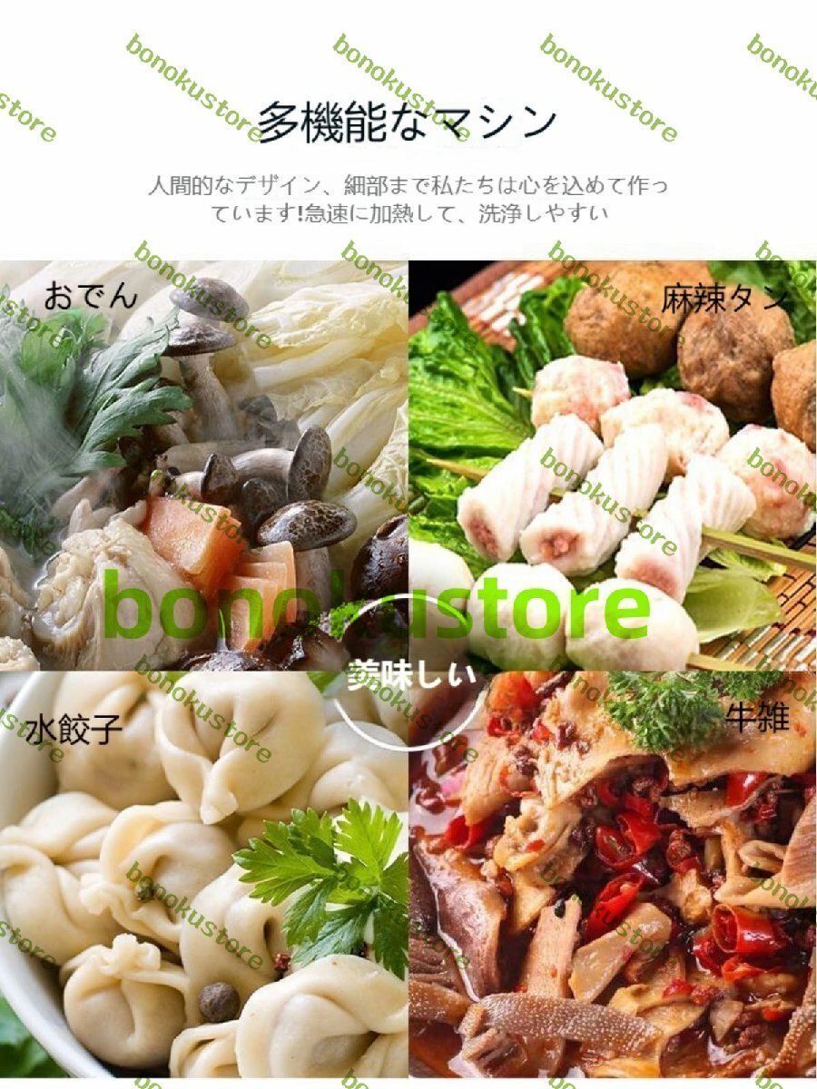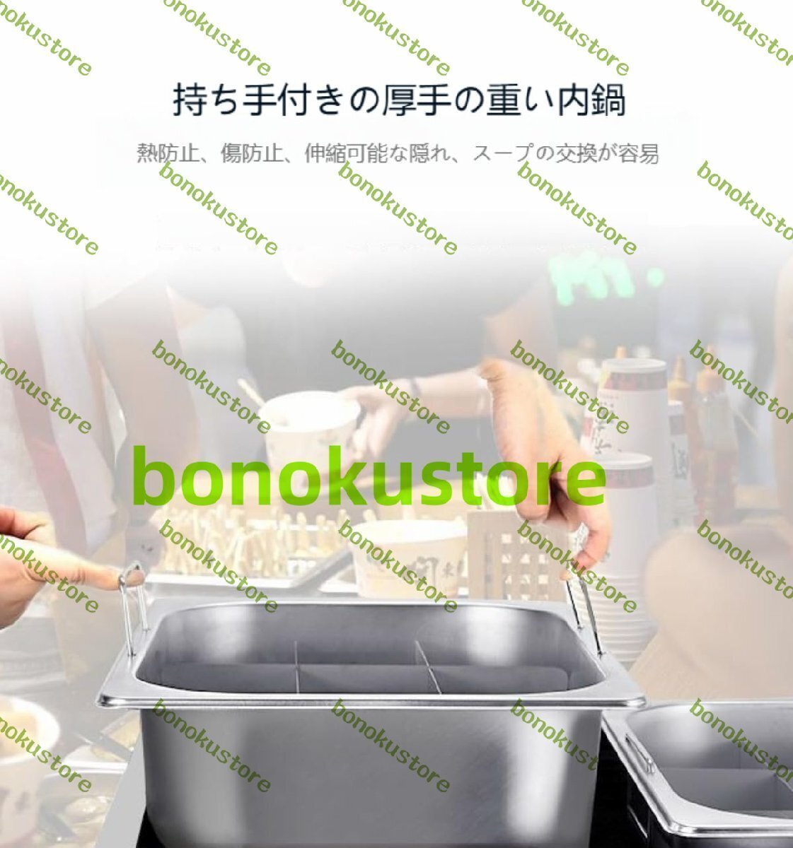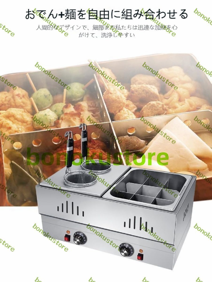 商品の説明 ステンレス鋼おでん鍋 電気おでん鍋 業務用デスクトップおでん機スーププール 仕切り付 おでん 電気保温おでん鍋 湯煎式電気おでん鍋 関東煮 多用途おでん鍋業務用 商品:単円筒 9 グリッド/二重円筒 18 グリッド 温度範囲:50-300℃ おでん鍋はステンレス鋼で作られて、耐食技術、火傷防止設計、長時間高温環境で作業しても変形せず、頑丈で耐久性がある。内鍋の材質はステンレス鋼で、耐久性があり、硬度が高く、より良い耐食性・耐摩耗性。 おでん鍋の容量が大きくて、複数人前の料理にも対応できる。 鋳造アルミニウム加熱プレート、通常の加熱パイプより熱伝導がより均一で、より速く、長寿命。 油温は50~300℃の温度範囲で自由に調整でき、さまざまな珍味に対応し、さまざまなスナックのニーズを満たすことができる。 分割式のデザイン、内鍋は洗いやすい。 注意事項と免責事項:本製品は固形油(固形バター、固形ラード、ショートニング、エッジオイル、ホイップクリーム等)の加熱には使用できない。 液体油を添加しないと使用できない。