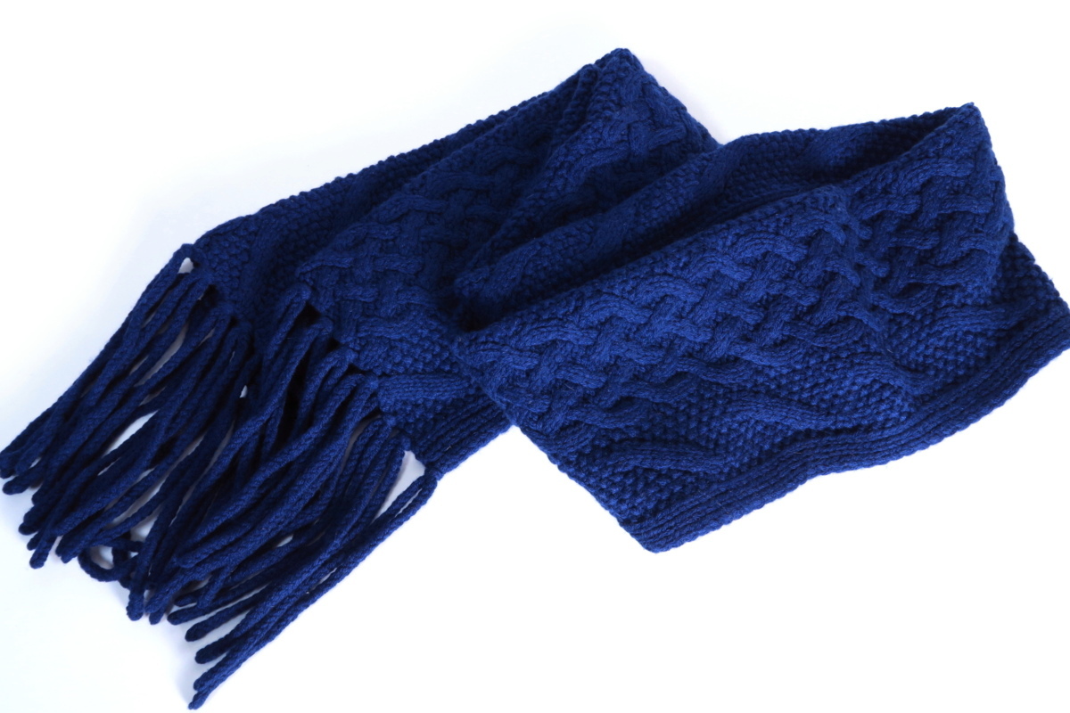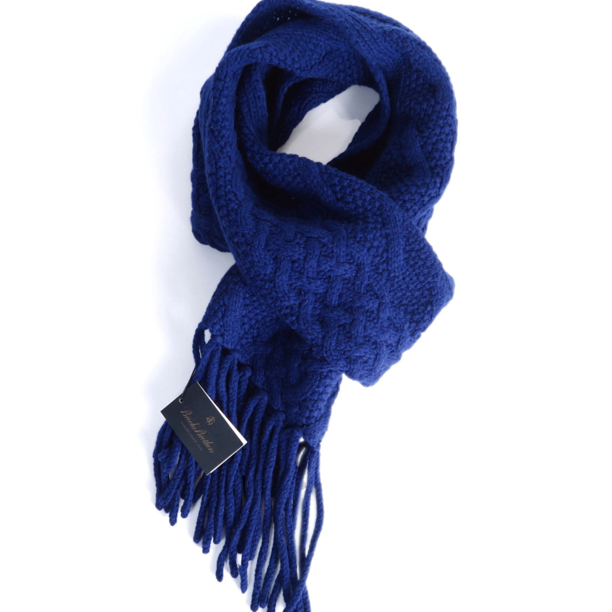 3万新品本物BROOKSBROTHERSブルックスブラザーズ【肌触り滑らか◎カシミア混】洒脱に格上げ!!ケーブル編み×フリンジ!!ウールマフラー/青