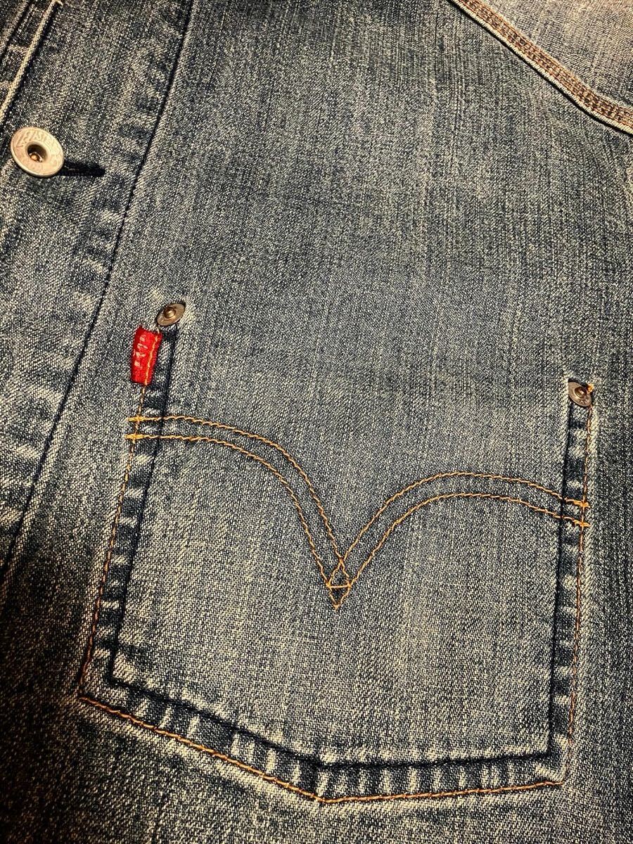 特徴的なのは、表から見ると左胸にポケットがありそうで、実は裏側に貫通する“インナーポケット仕様”になっている点。機能性とミニマルなデザインを両立した、非常にユニークなディテールです。さらに胸元にはリーバイスの象徴であるアーキュエイトステッチと赤タブがあしらわれ、ブランドのDNAをしっかりと感じさせます。