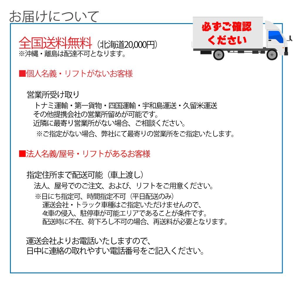 全国送料無料(北海道20,000円) ※沖縄・離島は配達不可となります。 ■個人名義、リフトがないお客様 営業所受け取り トナミ運輸・第一貨物・四国運輸・宇和島運送・久留米運送 その他提携会社の営業所留めが可能です。 近隣に最寄り営業所がない場合、ご相談ください。 ※ご指定がない場合、弊社にて最寄りの営業所をご指定いたします。 ■法人名義・屋号、リフトがあるお客様 指定住所まで配送可能(車上渡し) 法人、屋号でのご注文、および、リフトをご用意ください。 ※日にち指定可、時間指定不可(平日配送のみ) 運送会社・トラック車種はご指定いただけませんので、 4t車の侵入、駐停車が可能エリアであることが条件です。 配送時に不在、荷下ろし不可の場合、再送料が必要となります。 運送会社よりお電話する場合がございますので日中に連絡の取れやすい電話番号をご記入ください。 |