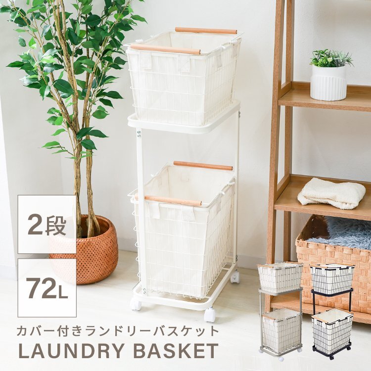 ランドリーバスケット 72L (ホワイト) 2段 カバー付 ランドリーワゴン 北欧 おしゃれ ラック 大容量 キャスター付き 洗濯かご 脱衣か