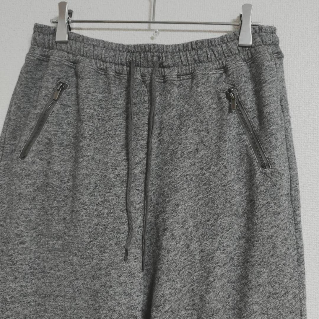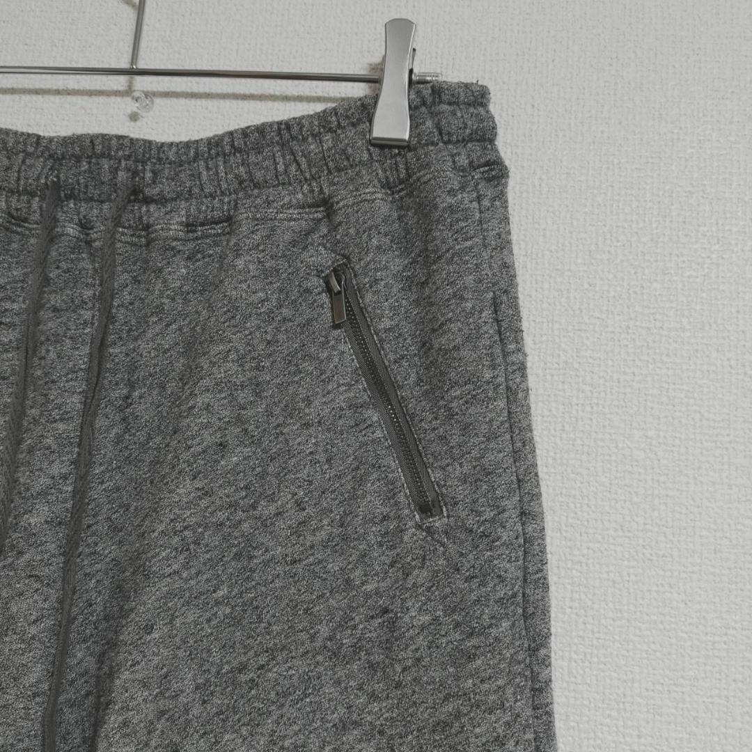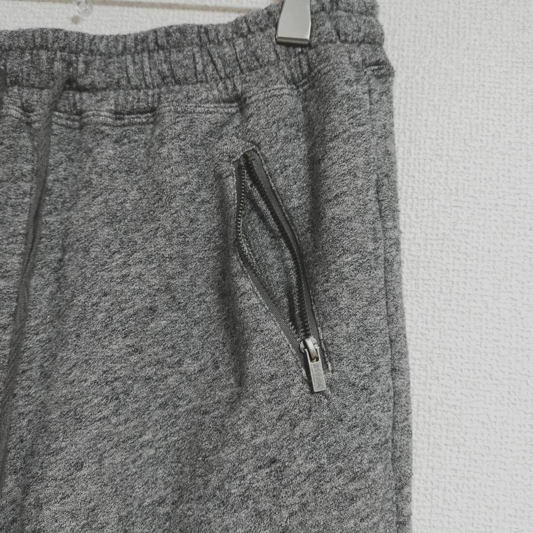 ジッパーポケット付きのグレーのスウェットパンツ、リブ裾デザインで快適な着心地。