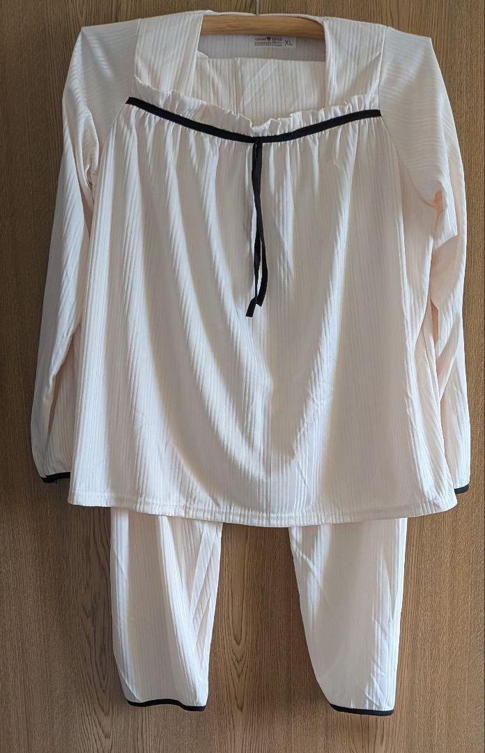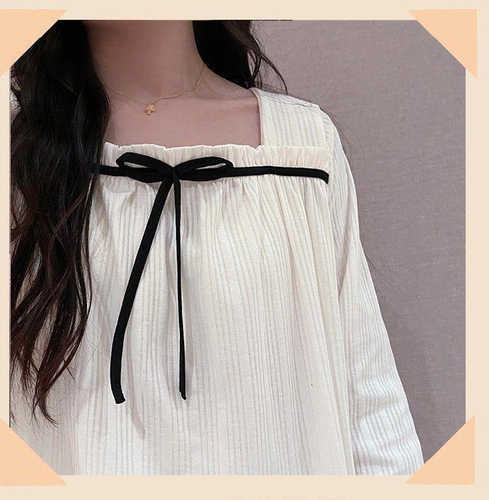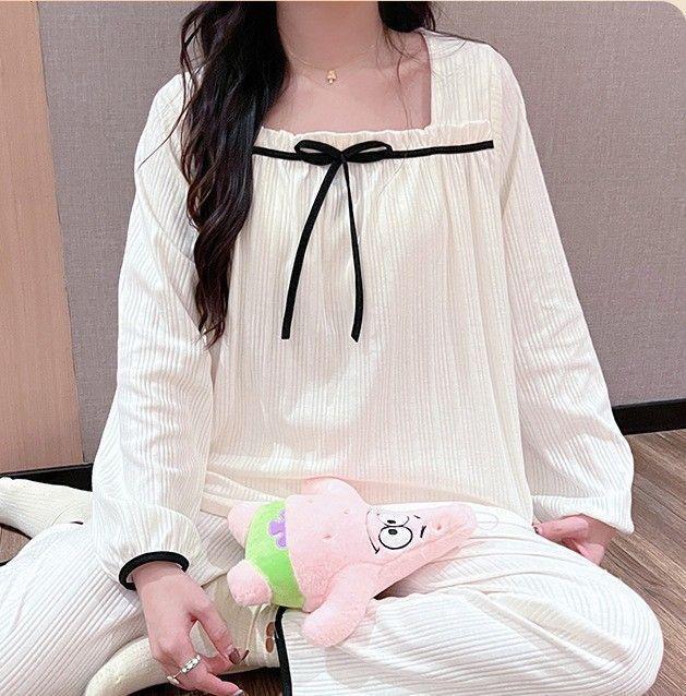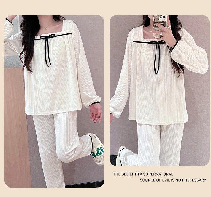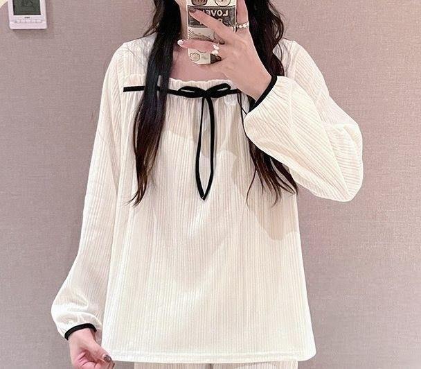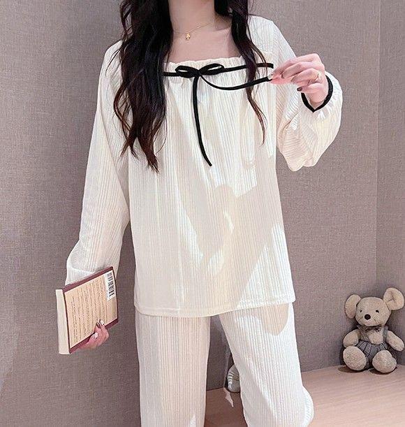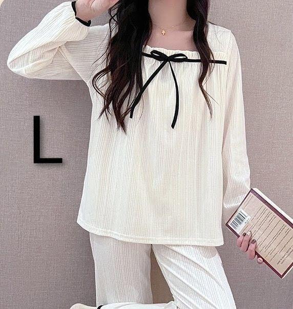 お家のリラックスタイムでも可愛くいたい女性の希望に答えたリボン付きタック入りフリル襟の部屋着上下セットです。