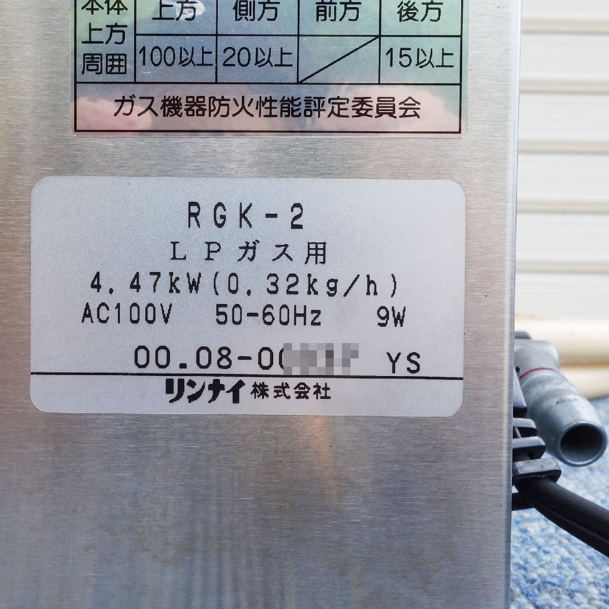 送料無料 ◆ 本体のみ リンナイ ガス ブラスト式 強熱グリラー ◆ LPガス RGK-2 串焼 コンパクト 幅600×奥行300mm LP