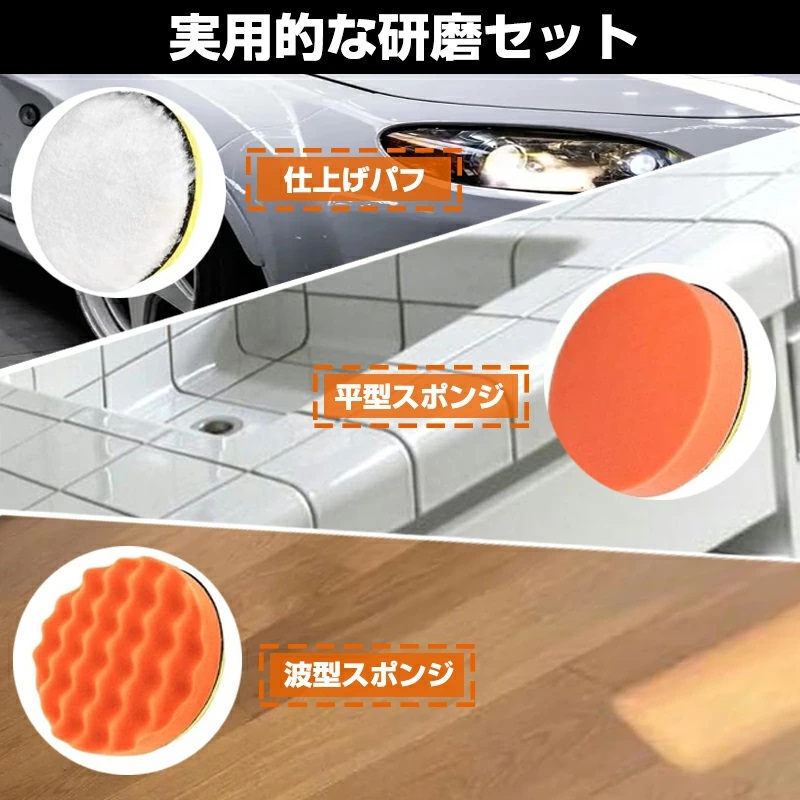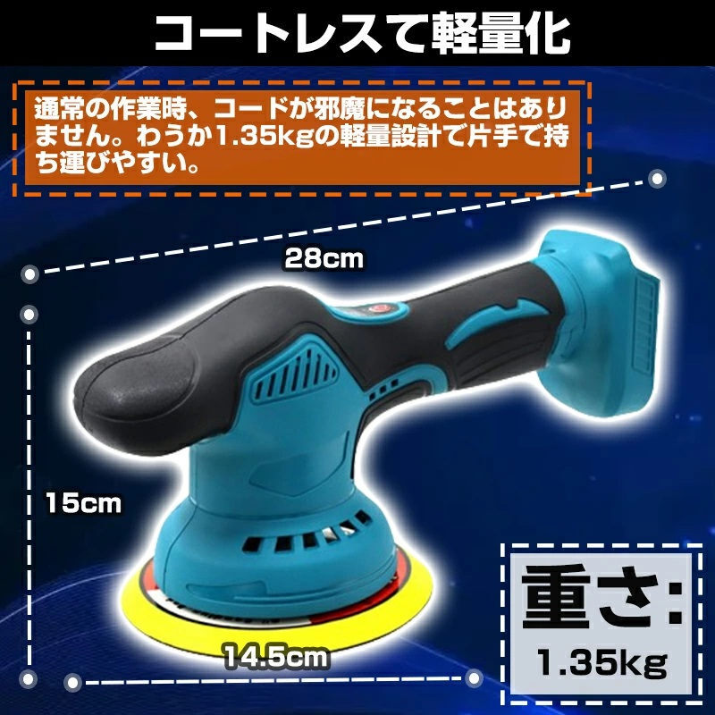 本体重量わずか1.2kg(バッテリー含む)。ウールパッドやスポンジパッド付属で車体はもちろん、浴室やタイル、ヘッドライトの研磨にも最適です。