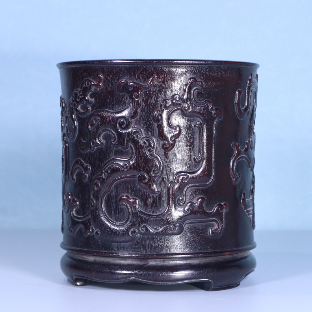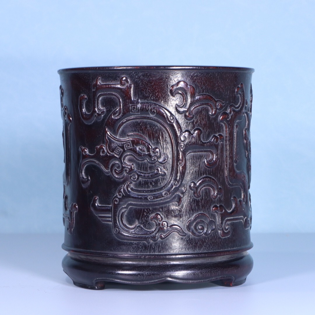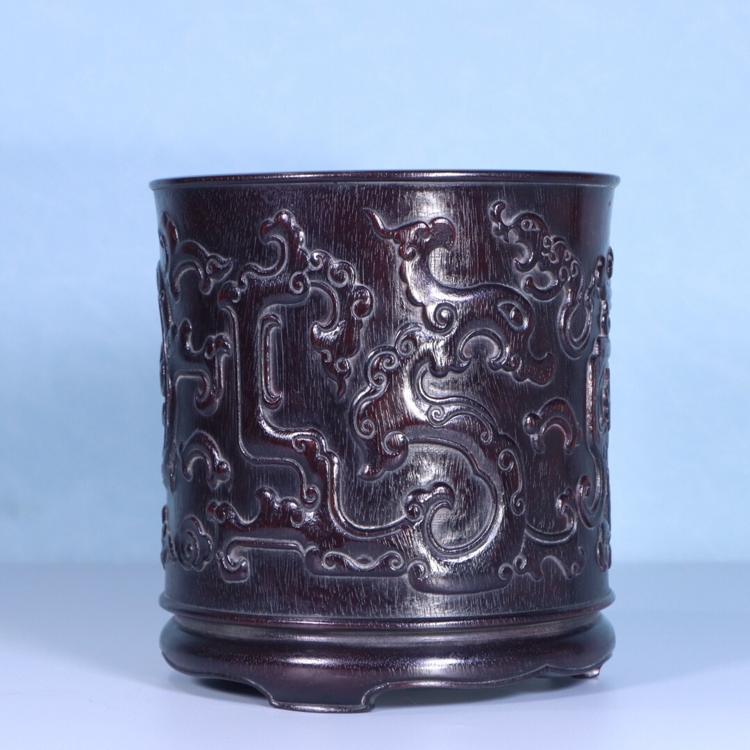 「清時代 老紫檀の木 彫り 拐子龍紋文房筆筒」極細工 擺件 賞物 古美術 骨董品 旧蔵出