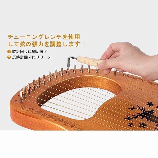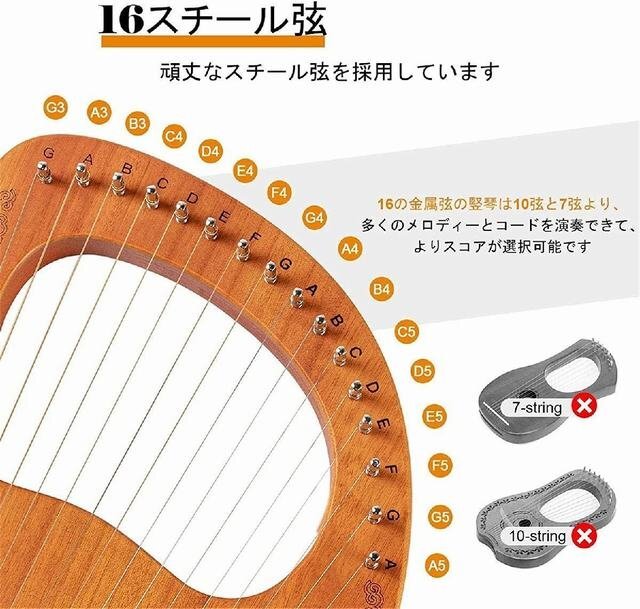 【サイズ】:掲載サイズ表をご参照ください。 【高品質素材】 楽器素材として人気のソリッド?マホガニー材を共鳴箱に使用しています。密度と硬さに優れているので、安定した音を奏でます。温かく柔らかい音色が特徴です。 【16弦】 1(G3),2(A3),3(B3),4(C4),5(D4),6(E4),7(F4),8(G4),9(A4),10(B4),11(C5) ,12(D5),13(E5),14(F5),16(G5)。16弦はより多くのメロディーやコードが弾けるので10弦や7弦と比べると楽譜の選択幅が広がります。丈夫なスチール弦を使用。ナイロン弦より耐久性が高く、長持ちします。 【精巧なデザイン】 エッジ部分が丸みを帯びており、安全で楽に抱きかかえられます。 音の振動が良く伝わる骨サドルを使用、またループ状のデザインなので音が安定します。サウンドホール周辺には美しいデザインが描かれており、精巧な職人技で丹念に表面が磨かれたライアーは非常に滑らかで繊細な造りになっています。 【持ち運び便利】 収納ケース付きなので、コンパクトにどこへでも持ち運びができます。旅先へ携帯して、演奏することも可能です。キット内に調律用ハンマーも含まれており、時計回りまたは反時計回りに回転させて、弦の張りを調整出来ます。 【素敵なプレゼント】ライアーハープは家族でのパーティー、学校での演奏、アウトドア、レジャー等あらゆる場面で大活躍します。初心者から音楽のプロの方にもお薦めのプレゼントです。 【注意事項】 出荷前に点検と実施させていただいておりますが、輸送の関係で、ネジがゆるくなて、音が一部おかしくなる場合がございます。不良品ではありません、お客様ご自身でネジを少し締め付ければ直ります。ご了承ほどお願い致します。 モニターの環境等により、色の見え方に若干差が生じる場合がございます。