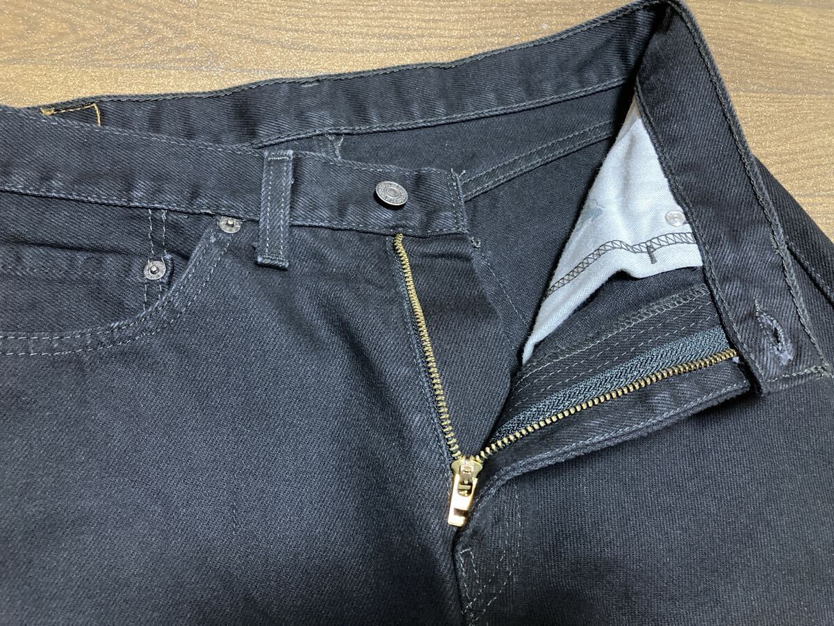 特徴は、ブラックメタル色のボタンやリベット、インシームダブル、耳脇割り無し、インディゴよりリラックスフィット寄り。