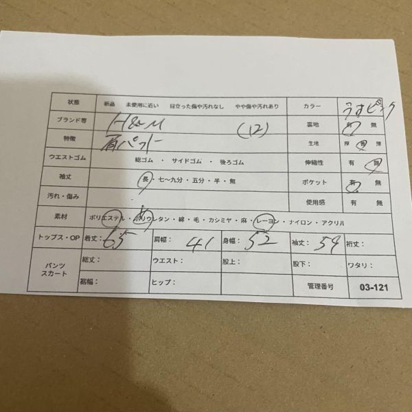 柔らかな印象を与える♪H&Mの淡ピンクテーラードジャケット - ブランド:H&M - サイズ表記:12(L〜LL相当) - 素材:ポリエステル レーヨン - カラー:うすピンク - シーズン:春秋 - 服の特徴:1ボタンテーラードジャケット、肩パッド入り、裏地あり - ダメージ・汚れ詳細:やや汚れあり - 袖の長さ:長袖 03-121 即購入大歓迎・お得な割引各種あります 詳しくはプロフィールをご覧ください! 匿名&送料無料 海外輸入のため全て一点ものです 古着のため使用感・毛玉等があることもあります。写真で状態の確認を行なってからご購入ください おまとめ買いでお得な割引あります♪ 平置き採寸表→写真から確認いただけます! (素人採寸のため、多少の誤差はご了承ください) 商品状態に関しては、写真、商品説明欄に記載しております。着用回数、購入時期などはお答えできませんので、ご了承ください。着画、写真の追加もお断りしております。 簡易包装のコンパクト発送となります。 畳みシワはご了承の程、宜しくお願いいたします。 商品によっては圧縮してお送りするものもございます。 撮影環境や使用するモニター、反映されにくい色味など、 商品と画像に若干の色誤差が生じますことをご了承ください。 出品作業の際にしっかりと確認はしておりますが、シミなどの見落としがある場合もございますのでご了承下さい。 古着の取り扱いになりますので特有の匂い等がある可能性があります。ご理解のある方のみご購入の程お願い致します。