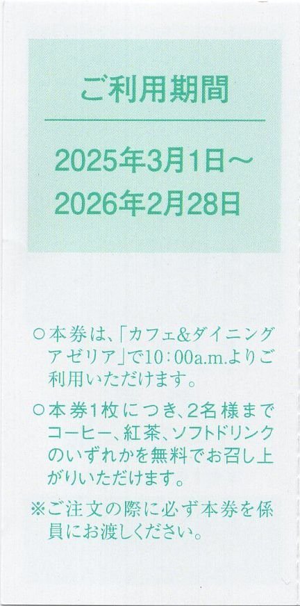 ・本券1枚につき2名様まで、コーヒー、紅茶、ソフトドリンクのいずれかを無料でお召し上がりいただけます。