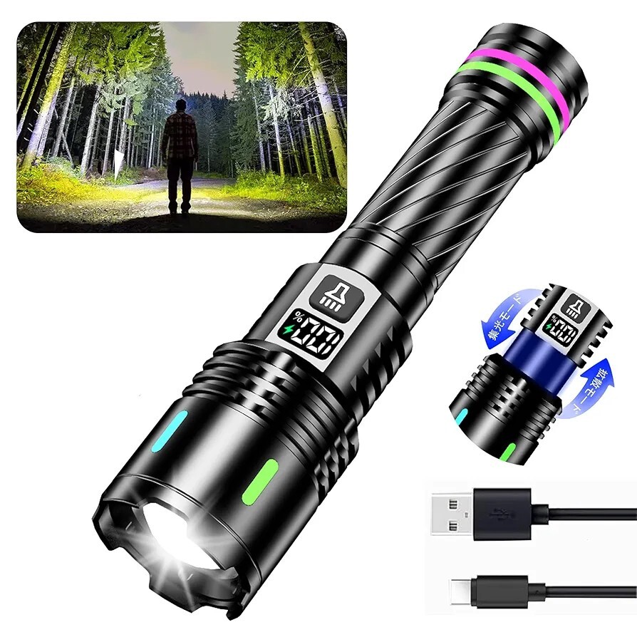 【多機能で強力なLEDライト】この懐中電灯は、高輝度のLEDを搭載し、最大照射距離は500メートルに達する超強力ライトです。投射された光束の明るさは完全に同じタイプの製品を超えており、懐中電灯 強力な性能を発揮します。ヘッドを伸縮させることで焦点距離を調整し、遠距離スポットライトまたは広範囲の汎光灯を自由に選択可能なフラッシュライトです。また尾にはフックが付いていて携帯性に優れたハンディライト。究極の費用対効果と実用性を完璧に兼ね備えたライトです。