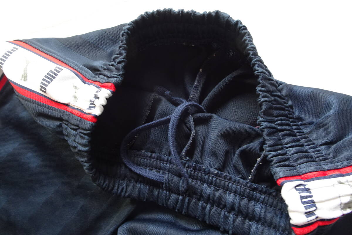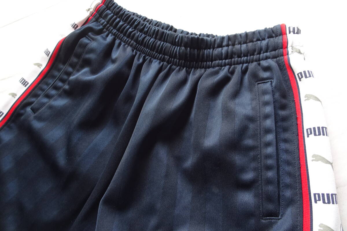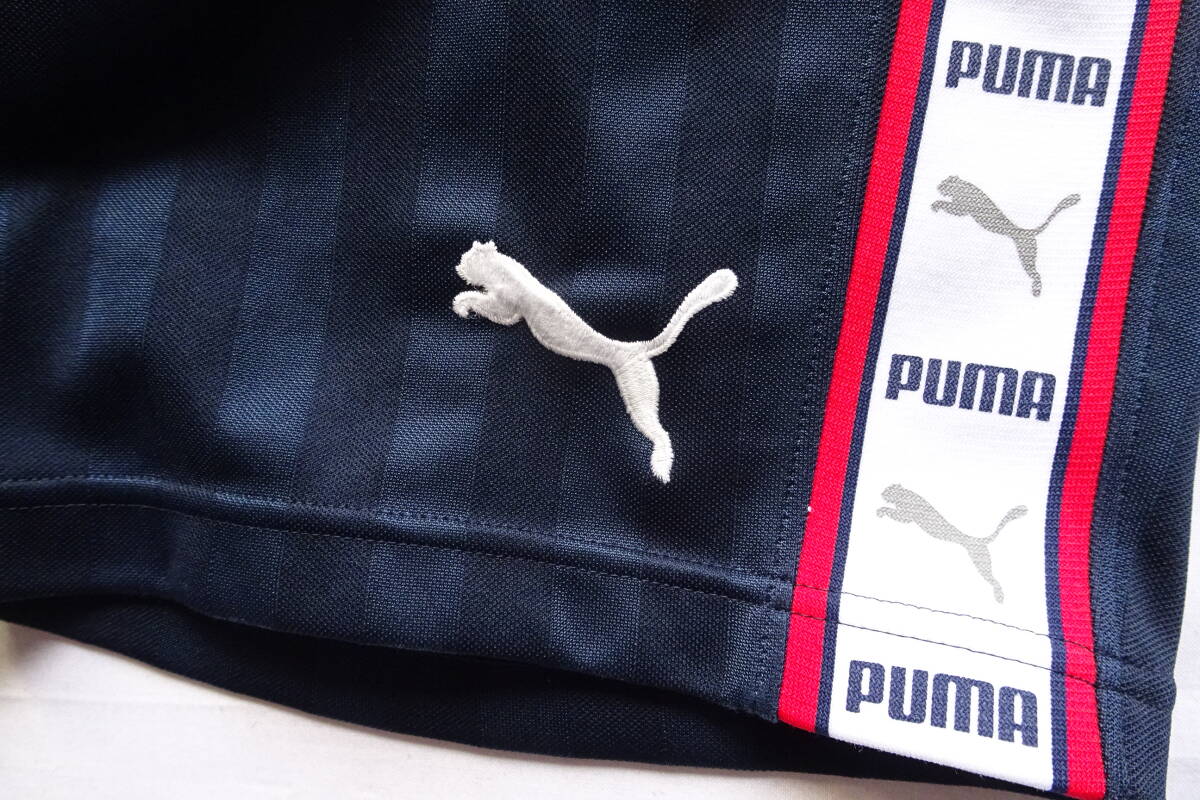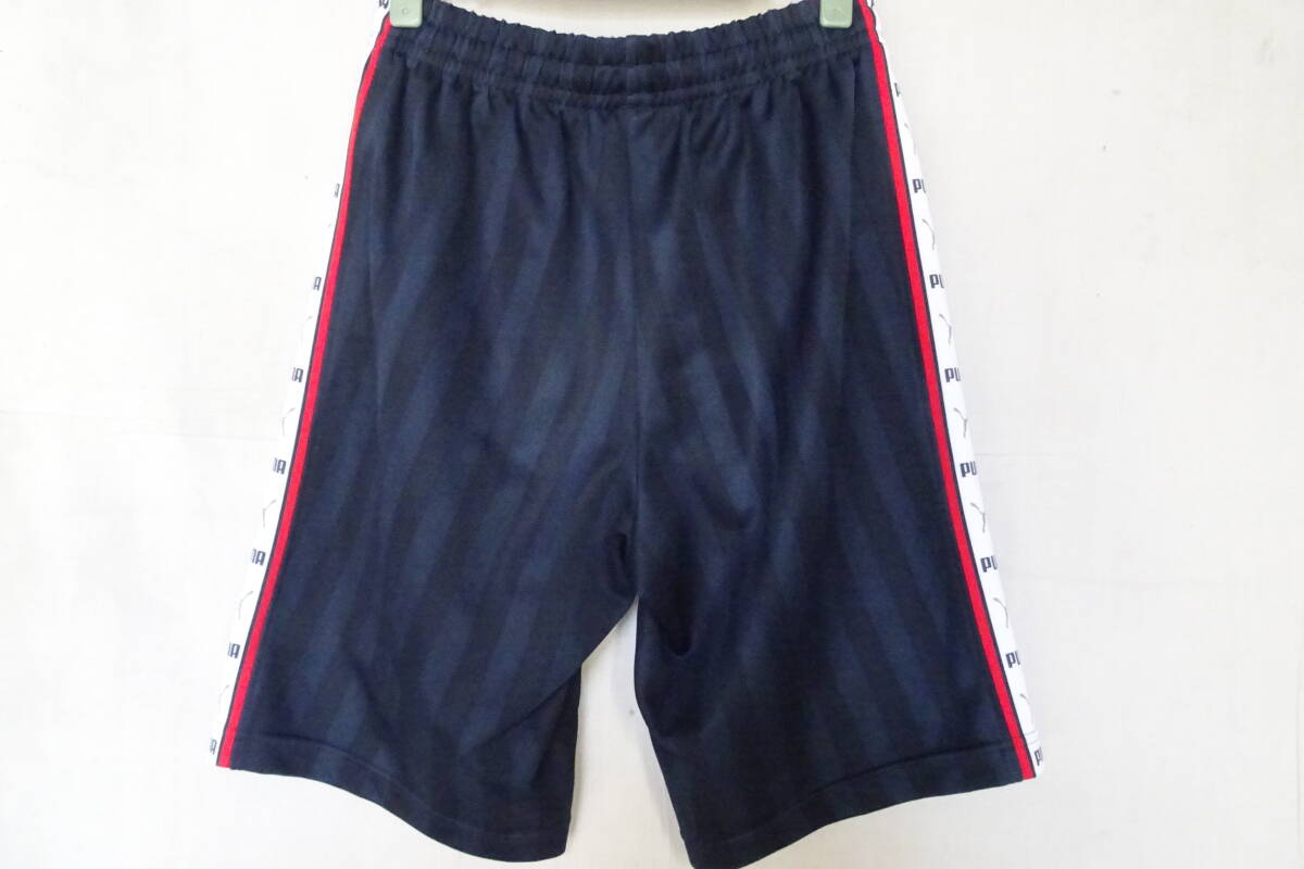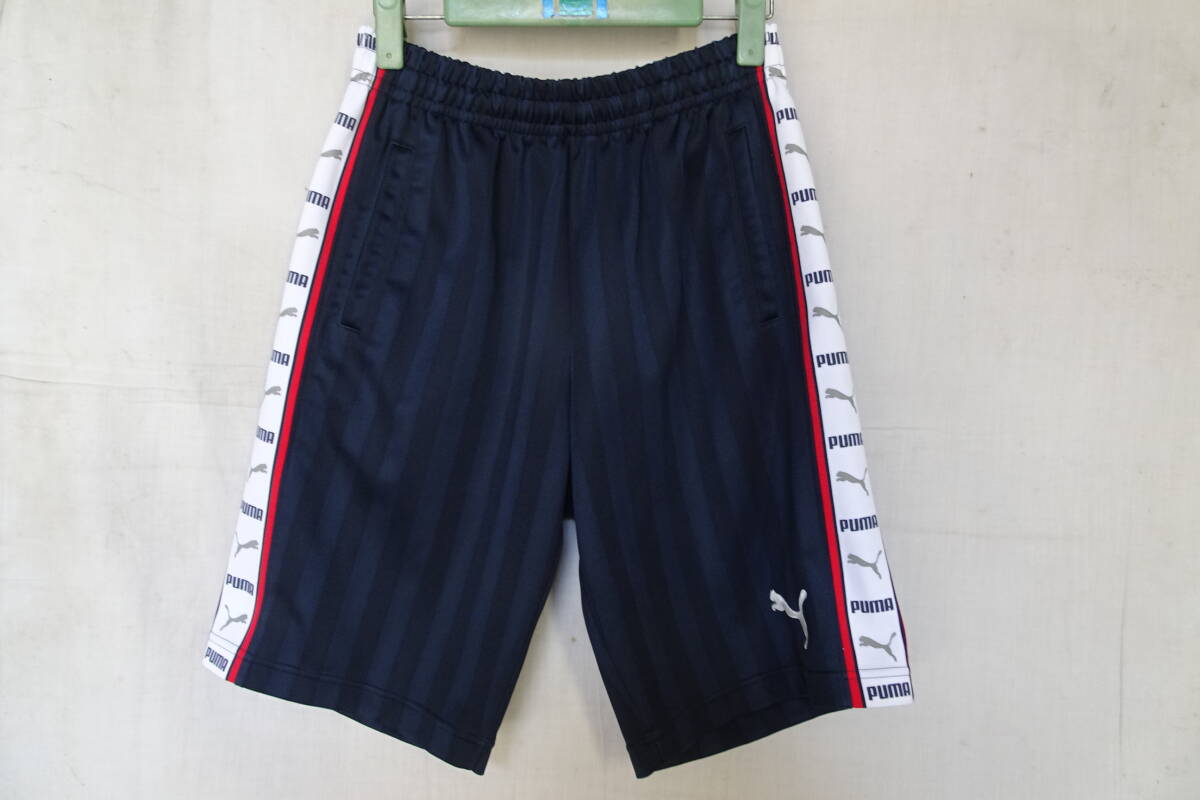 PUMA/プーマ/ショートパンツ/ジャージ素材/同色ストライプ柄生地/ひざ上丈/脇ロゴ入白ライン切替/スポーツ/紺/ネイビー/Sサイズ(10/9R7)
