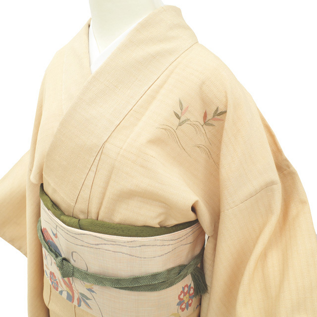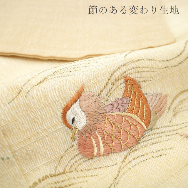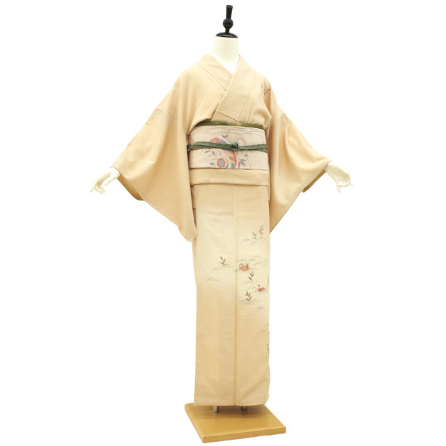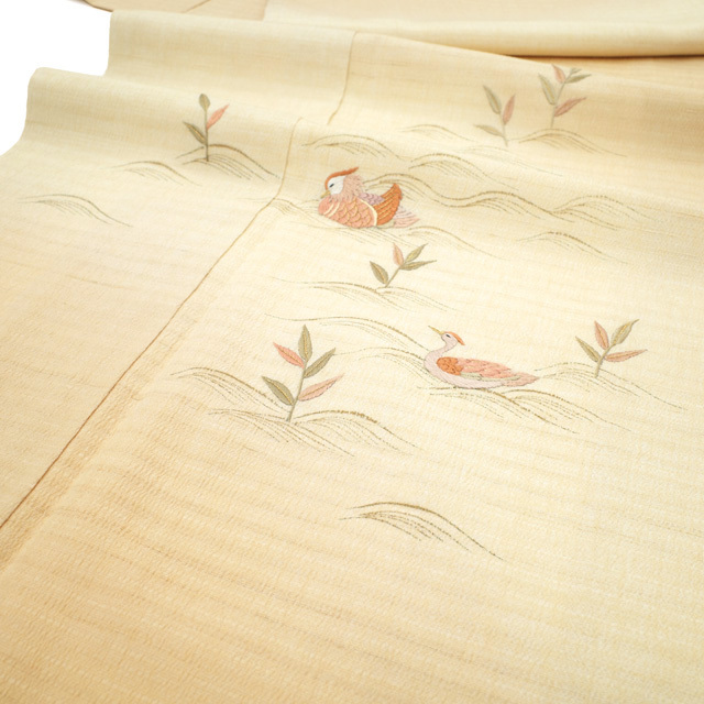 【新古品】 すごい値! 紬 訪問着 袷 ゑり善 扱い えり善 未使用 着物 正絹 手刺繍 薄オレンジベージュ 鴛鴦 水辺 葦 カジュアル 新古品 極上 仕立て上がり 身丈167 裄丈65 M~Lサイズ 春 秋 冬 未使用 紬の訪問着 紬 ゑり善 えり善 節のある変わり生地 観劇 お出かけ ショッピング など カジュアルシーンに たとう紙付き 送料無料 30代 40代 50代 60代 ~ 販売 購入 すごいね リサイクル みやがわ nek01515
