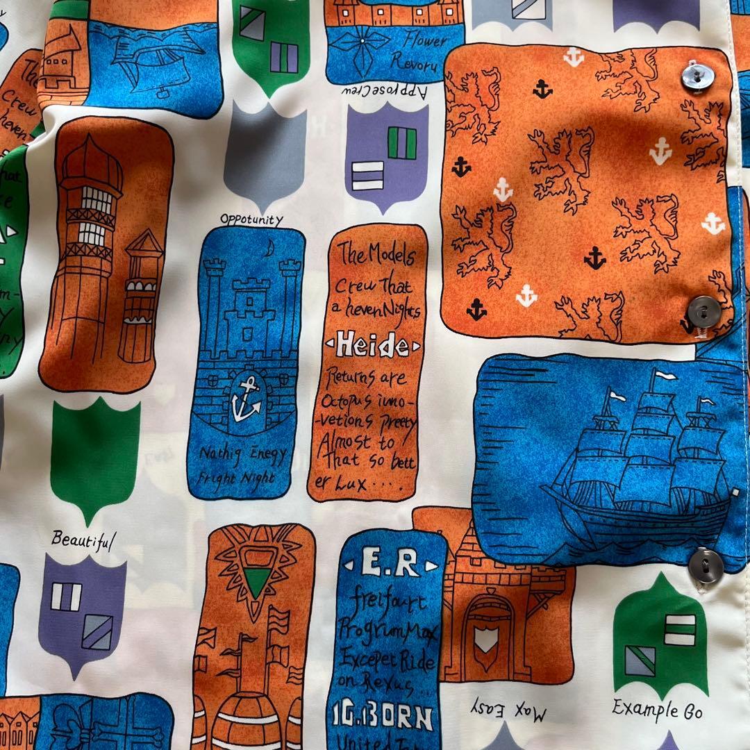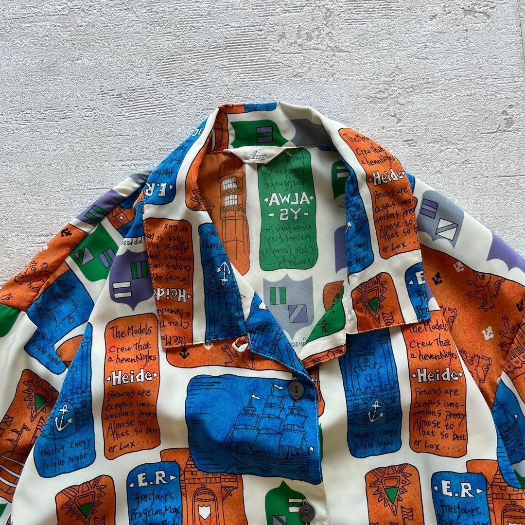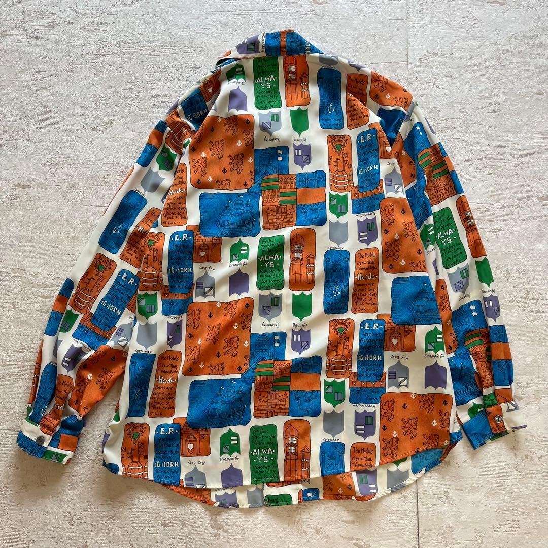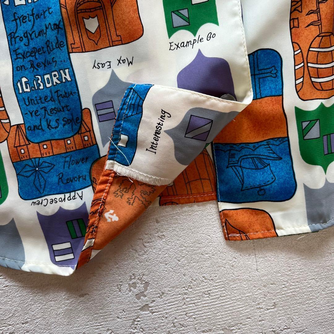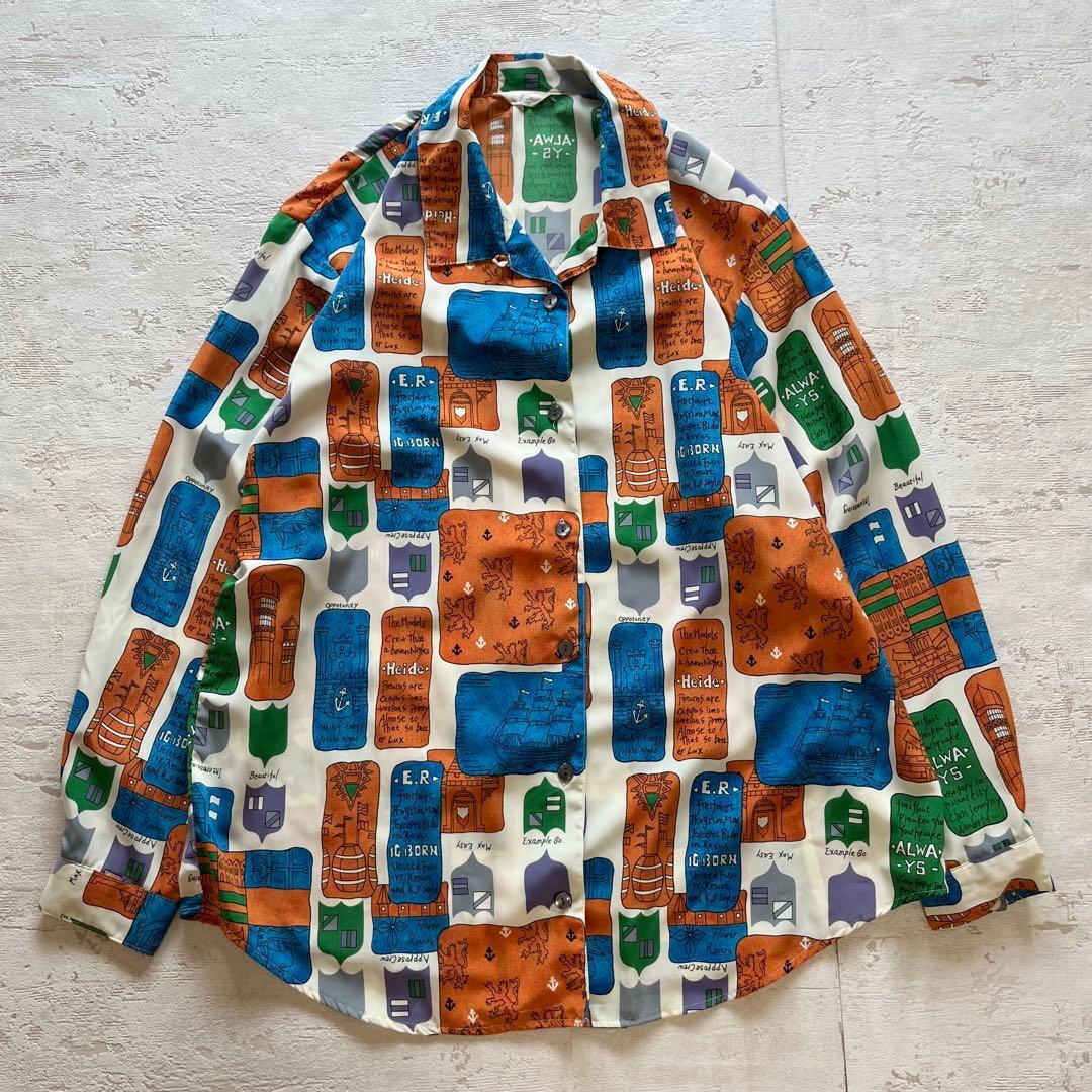 個性的で存在感のあるアートプリントが魅力の長袖シャツです。ブルー×オレンジ×グリーンのレトロな配色が印象的で、古着コーデやモード系スタイルにもぴったり。軽やかなポリエステル素材でさらっと着やすく、オーバーサイズ気味に羽織るのもおすすめです。