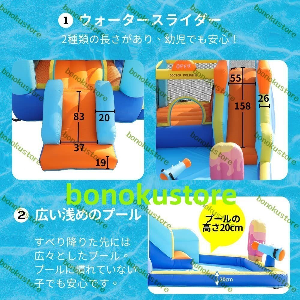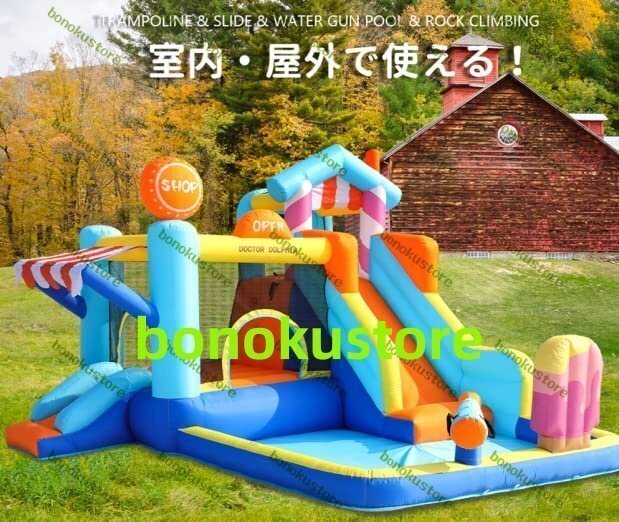 トランポリン&すべり台&水鉄砲つきプール&岩登り 新型 大型プール遊園地 対象年齢:18ヶ月から お子様1-4人用 ※当製品は体重30kg未満のお子様用 体重30kg以上のお子様や大人が使用すると、縫い目の穴が広がったり生地が抜け、しっかりと膨らまなくなる恐れがあります。 必ず耐荷重を守ってご使用ください。 お子様1-4人用:30kgx4人=合計耐荷重120kg お子様1-5人用:30kgx5人=合計耐荷重150kg 。
