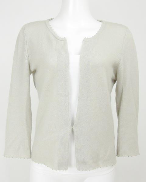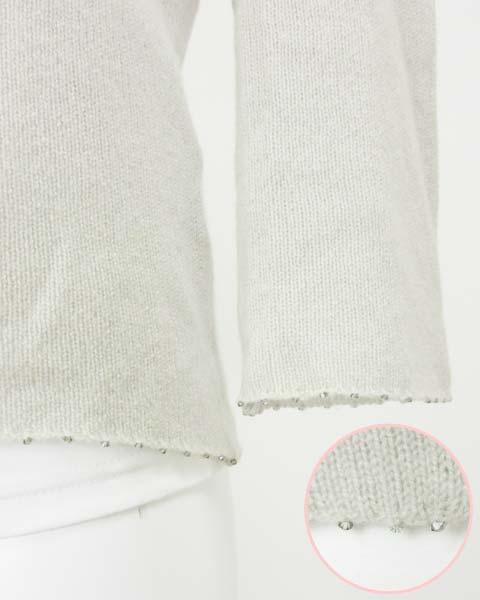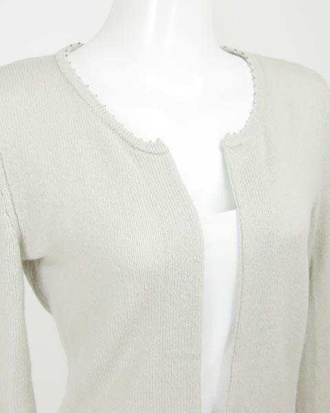 上品なデザイン、上質な素材のカーディガン。お首周りやお袖口や裾にビーズがついた、細かなところまでおしゃれです。肌触りの良いカシミヤ素材です。薄いグレーなので、黒やチャコールグレー、紺などとのフォクシーカラーとのコーディネートはいかがでしょうか? |