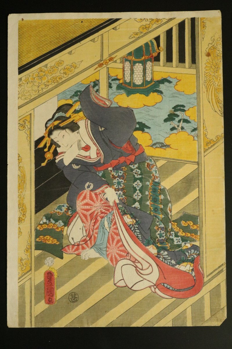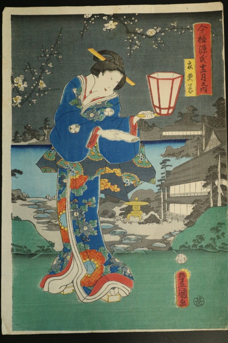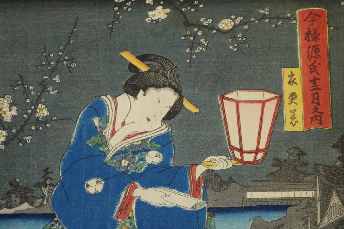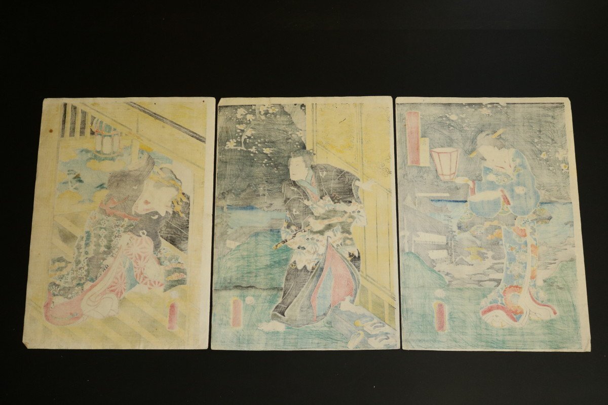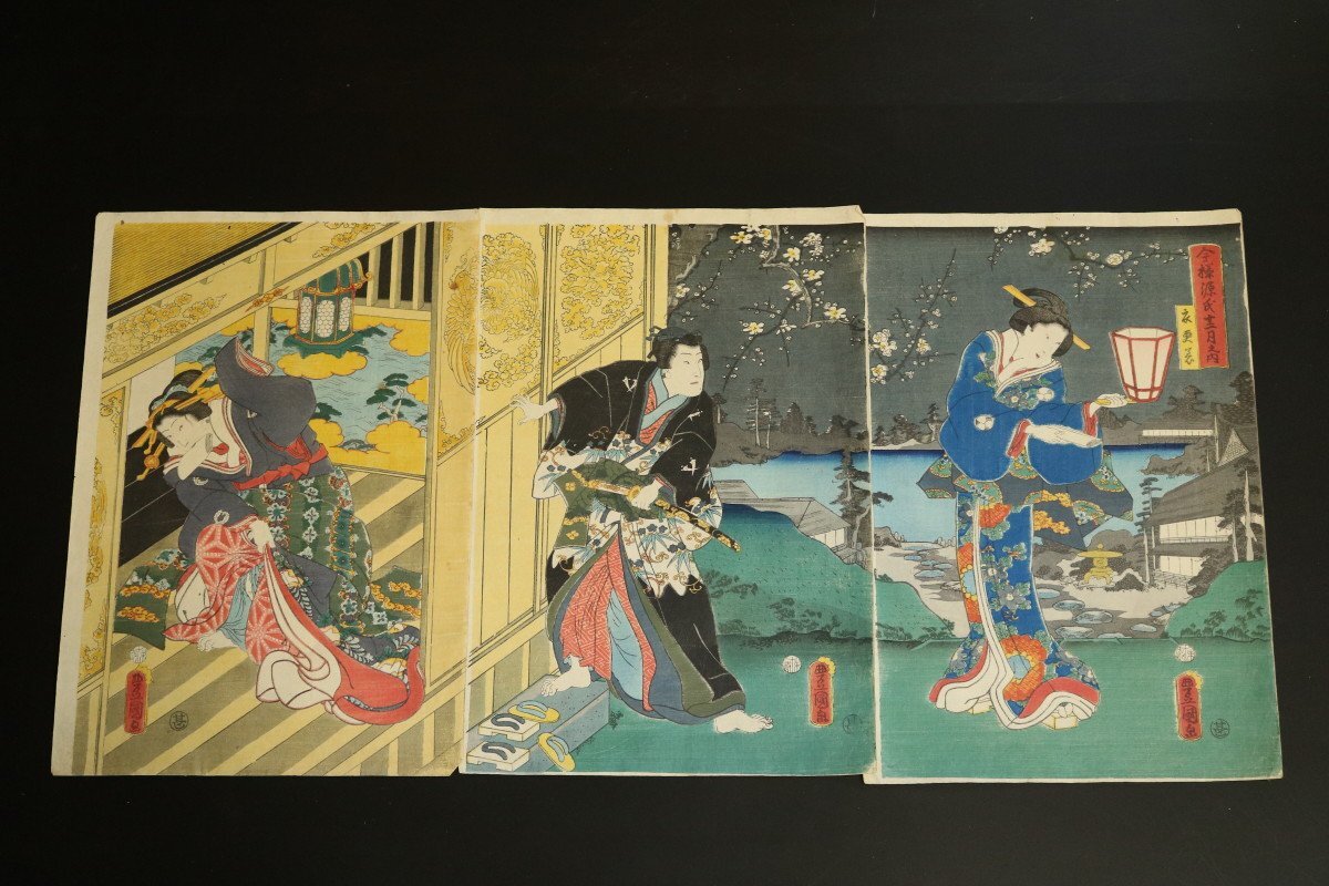 T370 木版画3枚 豊国 「源氏12ヶ月の内」 錦絵 浮世絵 絵紙 アンティーク 54966