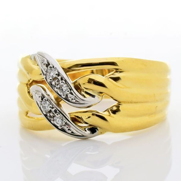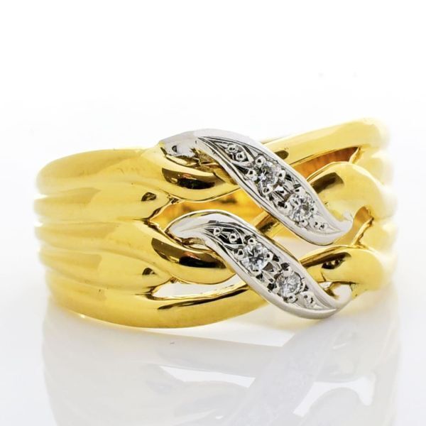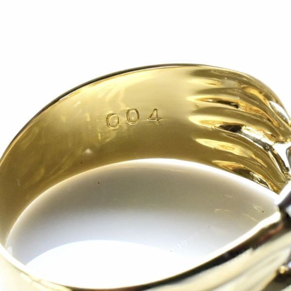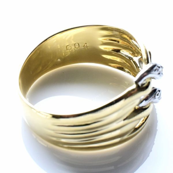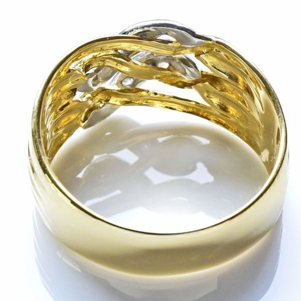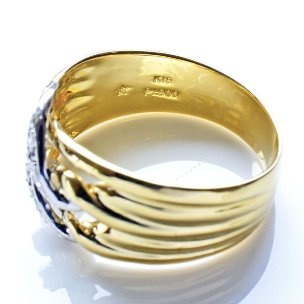 ★ 華やかに輝く 幅広リング ★ プラチナ900とK18イエローゴールドのファッションリング 優しいデザインが華やかな存在感を発揮する幅広で豪華なリングです 総重量は約4.888gと充分な質感です ダイヤモンドがトータル0.04ctセッティングされたお洒落なデザイン Pt900 K18 004 ☆ の刻印があります ※下取り品、仕上げ済です ※過度に力が加わる環境(スポーツやガーデニングなど)でのご使用にはご注意ください キズや石落ち、石欠け、リングの変形などの原因となります -----◇-----◇-----◇-----◇-----◇-----◇-----