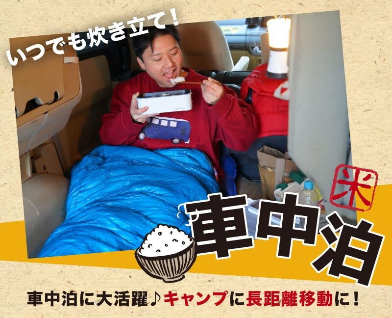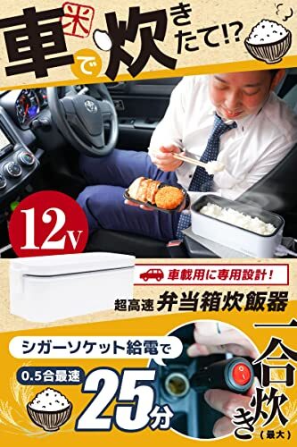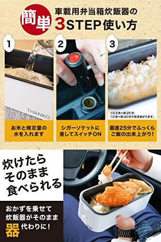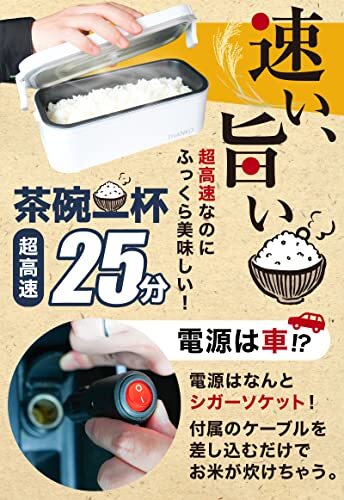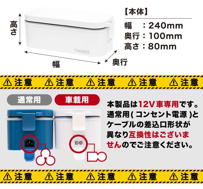 「THANKO 車載用12V弁当箱炊飯器 TKLUN21W 【シガーソケット電源】」▼4580060593330▼(商品説明)・ホワイト TKLUN21W・【サイズ】幅240×奥行100×高さ80(mm) 【重量】約817g(ケーブル含む)・【電源】DC12V 9.2A(シガーソケットより給電) 【定格電力】110W 【電流ヒューズ】10A・【最大炊飯容量】0.18L(1合) 【炊飯時間】0.5 合 約25 分/1合 約40分(浸水・蒸らし時間除く)・【素材】フタ:PC パッキン?シリコン、収納ポーチ:不織布、炊飯釜:アルミ/ フッ素加工 【ケーブル長】135cm・【モード】保温機能(温度センサー)、空焚き防止機能 セット内容炊飯釜、フタ、シガーケーブル、計量カップ、収納ポーチ、予備つまみ、取扱説明書 【期間】購入日より12カ月説明 商品紹介 炊き立てのお米はどこで食べても美味しい…そんなほっかほかの炊き立て米が作れる、車載用の12V弁当箱炊飯器が誕生しました!お米と水を入れて、シガーソケットに差すだけ。いつでもどこでも、美味しい炊き立てを味わうことができるんです。 ご注意(免責)>必ずお読みください 注意事項------------------------- ※おひとりさま用超高速弁当箱炊飯器(コンセント用)とはケーブルの形状が異なり互換性がございませんのでご注意ください。 ※ご使用中においてのお客様の過失による故障、破損、改造等はサポートの対象外となります。 ※内容品に記載している以外の物は付属しません。 ※本製品をご利用において生じる物品の破損/故障は、の対象外となります。 ※異常を感じたらご使用をやめてカスタマーサポートまでご連絡ください。 ※製品仕様はのため予告なく変更する場合があり、そのため説明書記載の内容と異なる場合があります。