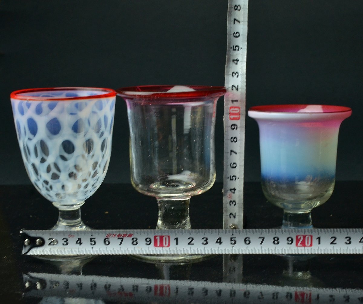 【YB】大正~明治ガラス ウランガラス 赤縁乳白色水玉模様・無地・乳白色氷コップ三点 ★日本古美術古玩骨董25Y908-5