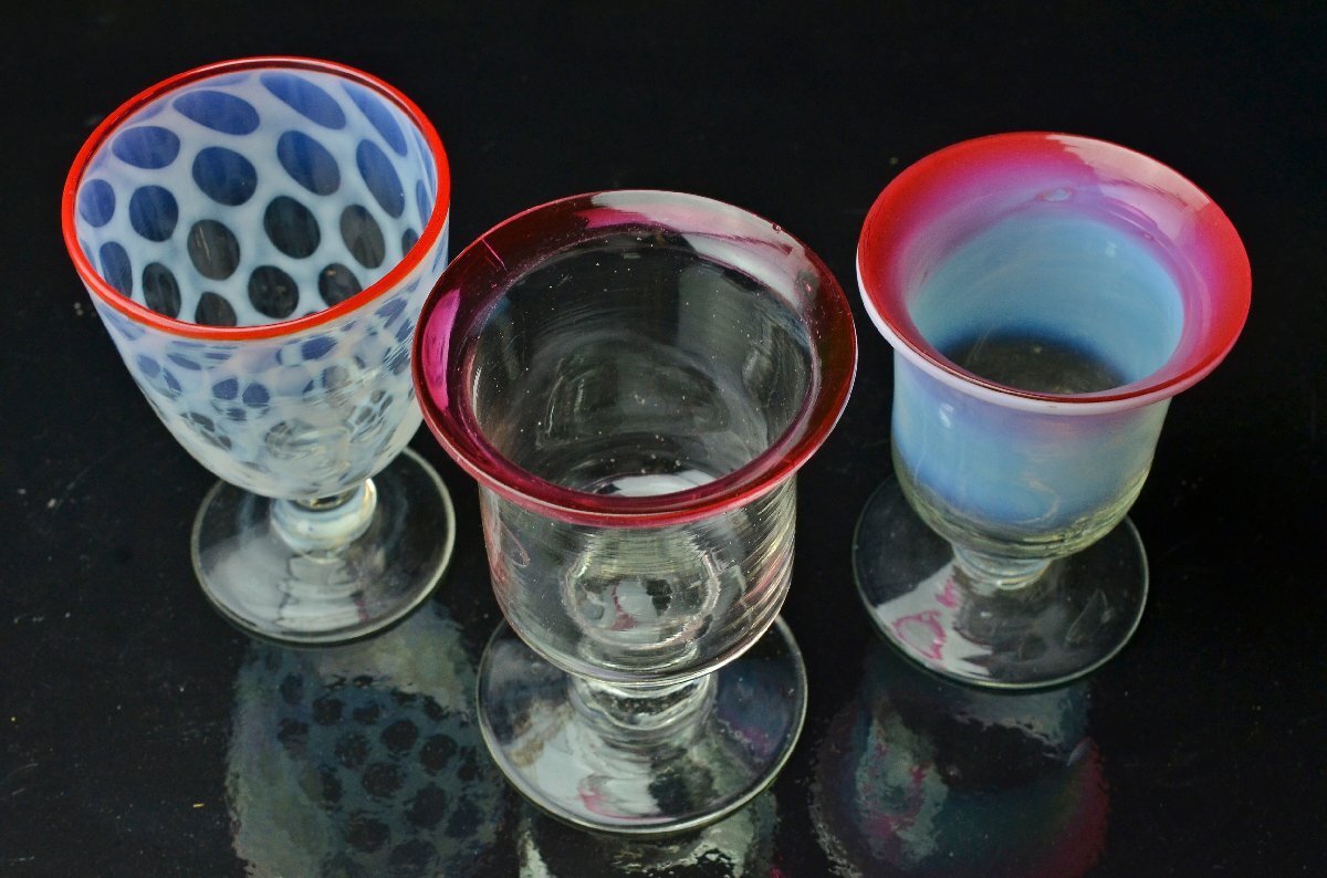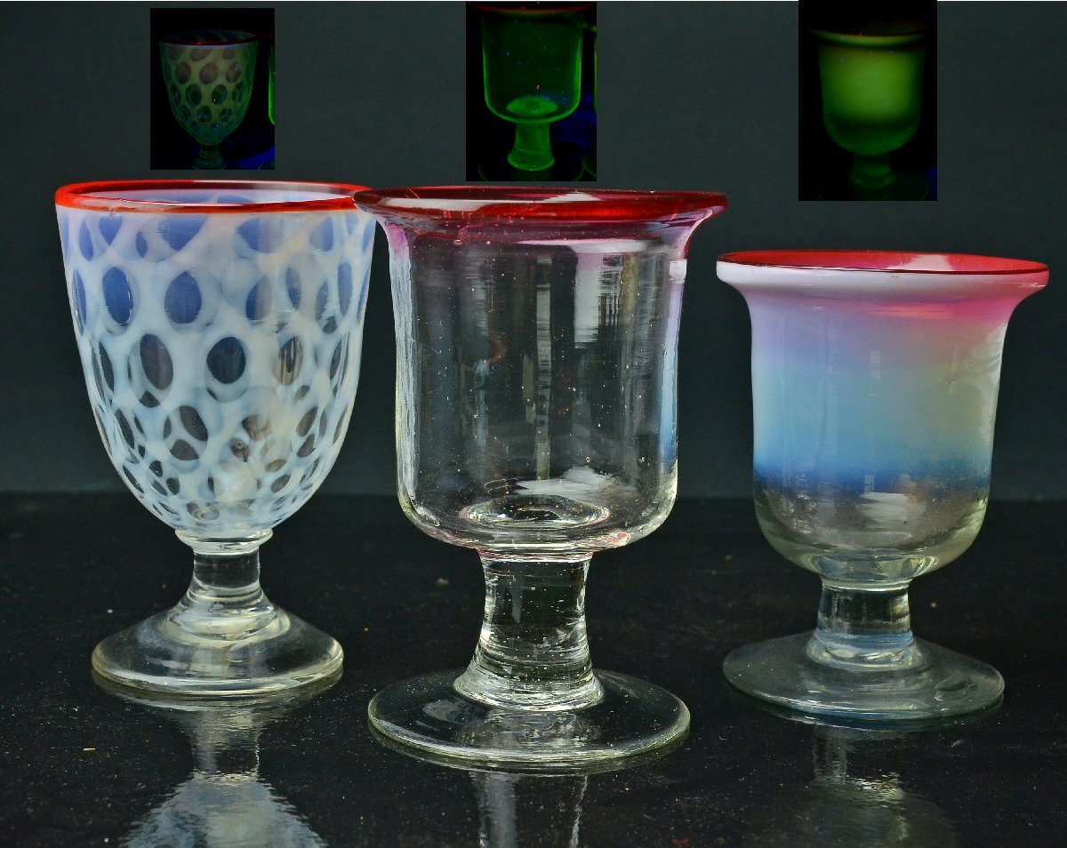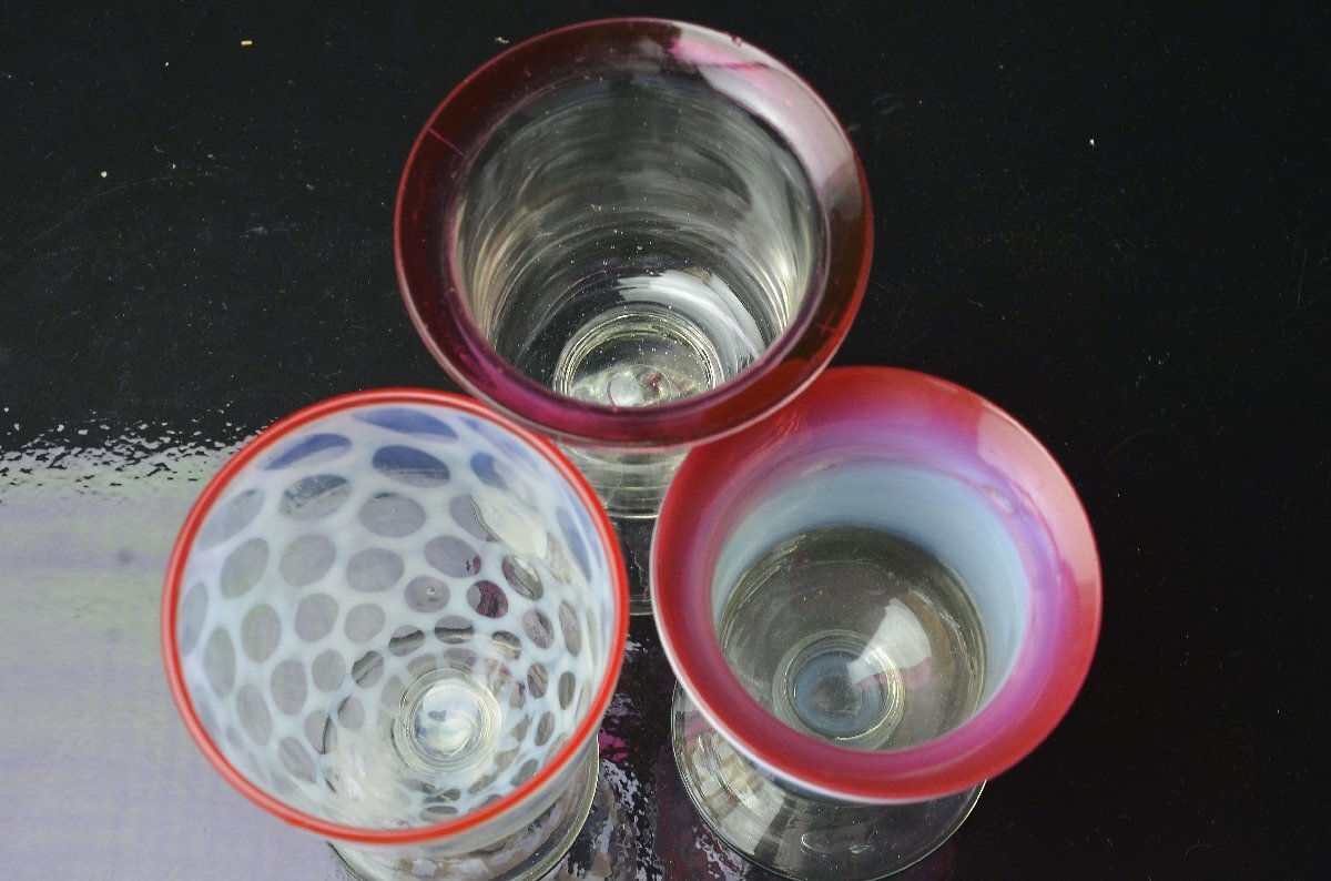 大正~明治ガラス ウランガラス 赤縁乳白色水玉模様・無地・乳白色氷コップ三点