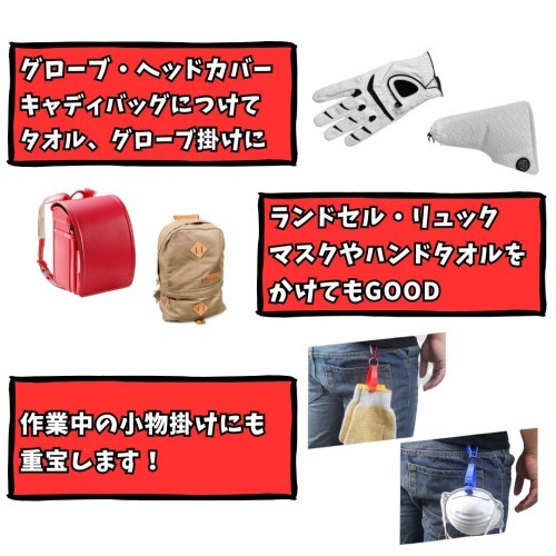 ・その他、軍手、作業用手袋、建築現場、大工、土木、アウトドア、BBQ、キャンプ、登山、DIY、ガーデニング、ウォーキング、散歩、釣り、フィッシング、ゴルフ、バイク、サイクリング、スキー、スノーボード、いろいろな場面で紛失防止になり活用できます