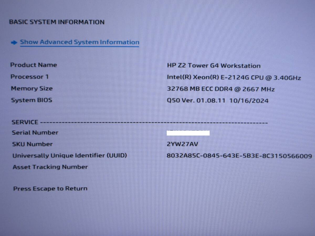 | 商品説明 | ■商品詳細■ 掲載の写真はすべて実物のものです。 メーカー:HP(ヒューレット・パッカード) モデル:Z2 Tower G4 Workstation CPU:Intel Xeon E-2124G @ 3.40GHz(4コア / 4スレッド / L3 8MB) メモリ:32GB(8GB×4 / ECC DDR4-2667MHz / Samsung製) ストレージ:SSD 512GB(Micron MTFDDAK512MBF) + HDD 1TB(WDC WD10EZEX) グラフィック:NVIDIA Quadro P2000 光学ドライブ:HLDS DVD±RW GUD1N LAN:Intel Ethernet Connection I219-LM BIOS:Q50 Ver. 01.08.11(2024/10/16更新済み) 【付属品】 本体のみ ※写真に掲載のものが全てです ■動作確認内容■ OSはWindows 11 Pro for Workstations 64bit (24H2) をインストール済み (デジタルライセンス認証済み) ・通電〜画面出力 ・BIOS画面の表示 ・Windows 11 Pro 起動確認 ・Windows Update を最新の状態まで適用済み ・CD読込確認済み ・TPM2.0搭載確認済み 動作確認は以上になります。 上記確認内容に関しましては、商品到着後1週間以内の初期不良は対応させて頂きます。 【特記事項】 ・外装にスレやキズあり(写真参照) ・中古品のため細かい状態は写真にてご確認ください ■外観の状態■ 簡易クリーニング済みです。 中古品の為、使用感や小傷等がございます。 (整理番号:Z386) E | |||||||||||||||||||||||||||||||||||||||