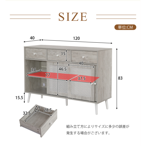 • 【大容量収納スペース】天板は幅120cmと広々、TV台として使用したり、大きめのインテリア雑貨などもディスプレイできます。またお茶やコーヒーをいれる作業台としてもお使いいただけます。奥行は40cmで、家電や本、小物など様々な物のまとめ収納を可能に。