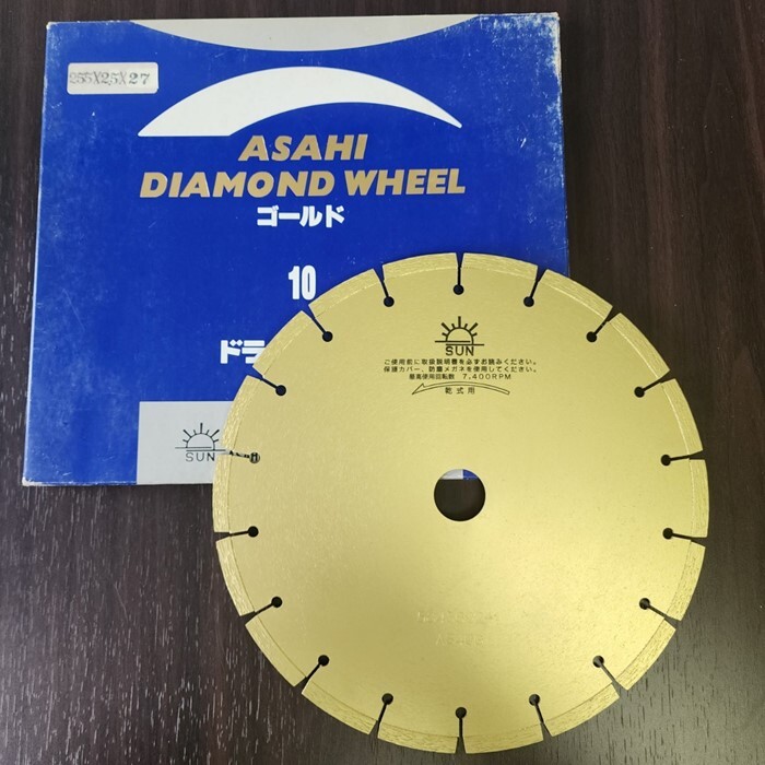 製品は新品未使用品となります。化粧箱にスレ、キズ、汚れがございます。予めご了承下さい。旭ダイヤモンド工業株式会社ゴールド 乾式用最高使用回転数7,400新品 旭ダイヤモンド 10インチ 外径255mm×厚み×2.5mm×穴径27mm ダイヤモンドカッターリング無し本製品1枚入り電動工具用 ダイヤモンドカッター乾式研削用 コンクリート用【検索ワード】・コンクリート・レンガ・ブロック・モルタル・スレート・大理石・鉄平石・アスファルト・新建材・磁器タイル・陶器タイル・石州タイル・三州タイル・セメントカワラ・石材全般などコンクリートカッター ブロック切断 切断機 替え刃 替刃 ダイヤ砥粒 瓦 サンダー 日立 マキタ リョービ 東芝 三菱 神鋼 ミタチ 高速 ボッシュ B&Dスキル