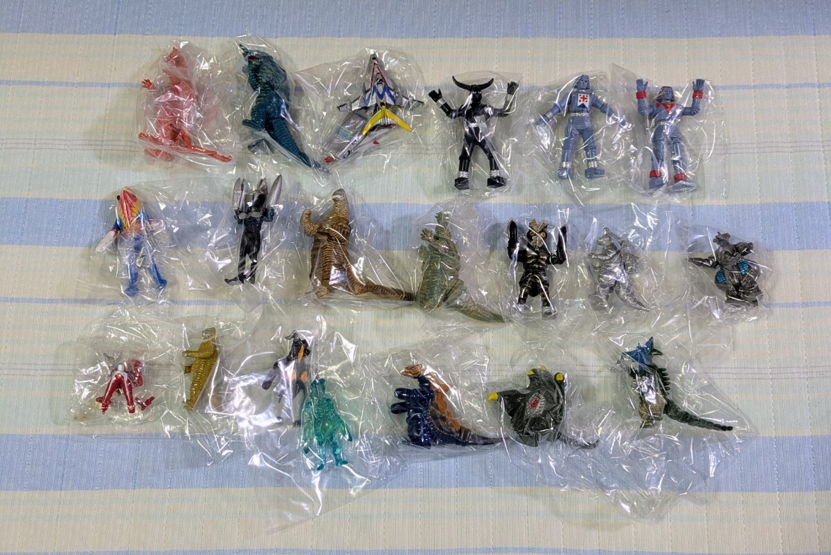 ★開封済みのフィギュアには、ベタつきがあるものもあります。未開封の物の細かいチェックはしておりません。ミニブックはすべてそろっているわけではありませんので、ご了承のほどお願いいたします。そして同じものが2個、3個、場合によっては4個とダブっているものもいくつかあります。たとえば零下140度の対決編のウルトラセブンとガンダー、怪しい隣人編のイカルス星人、他 ビルガモ、テンペラー星人、マグマライザー&ウルトラホーク3号、ゼットン、グドン、キングジョー、ナックル星人、ゴジラ4のゴジラ'98などはダブっています。他にもあるかもしれません。あくまで細かいチェックはしておりませんので、ご了承くださいますようお願いします。