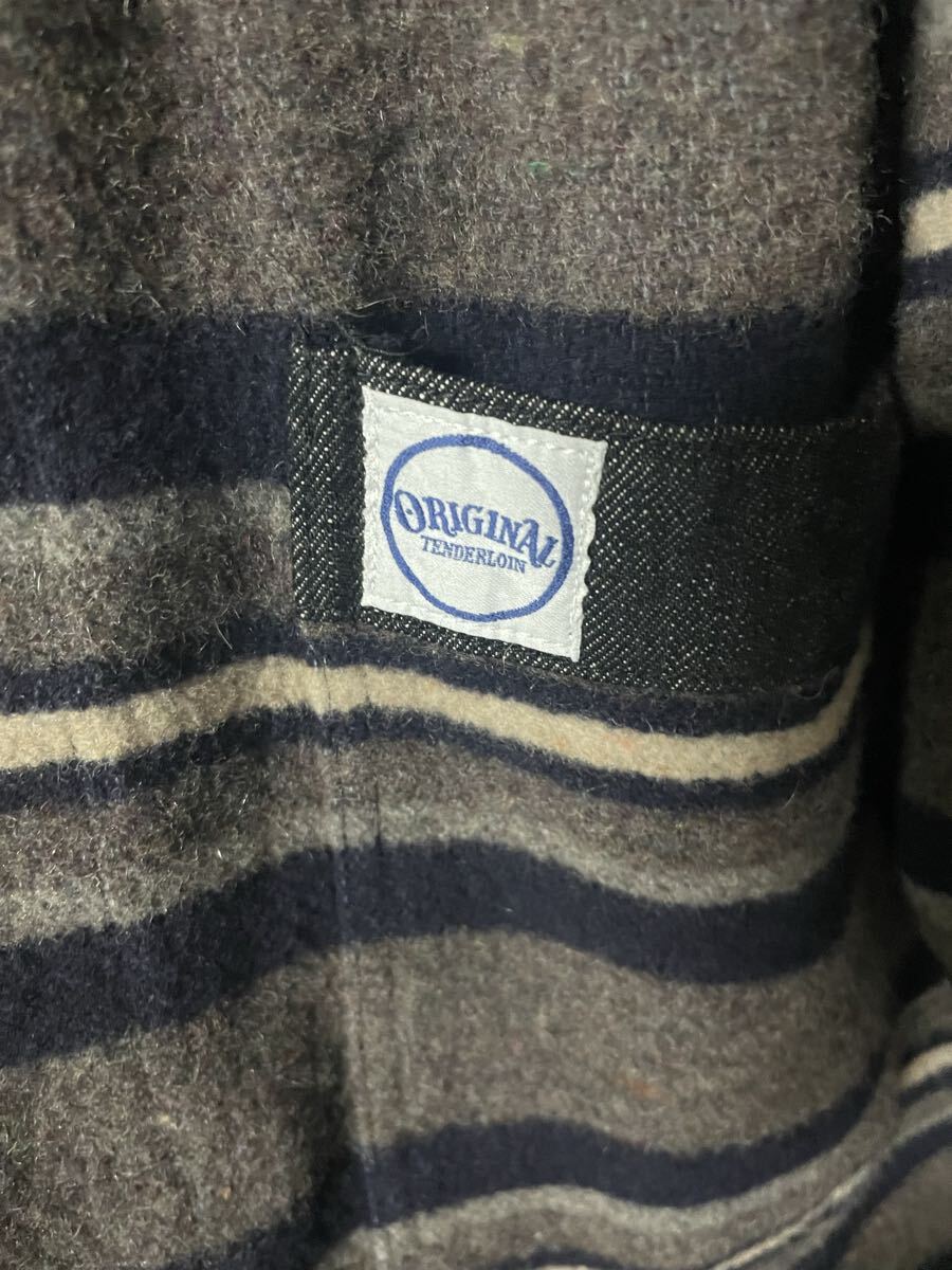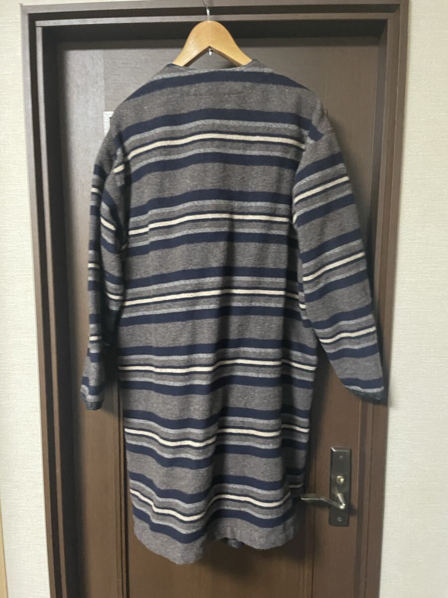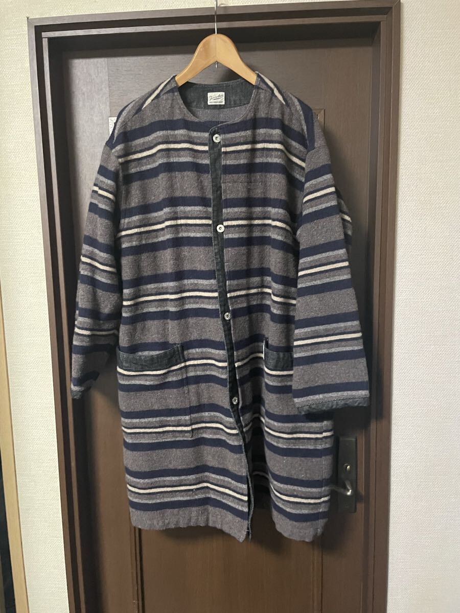 ストライプデザインのウール混紡ロングコート、ボタン付きでポケットあり。デニム生地部分は黒になります。