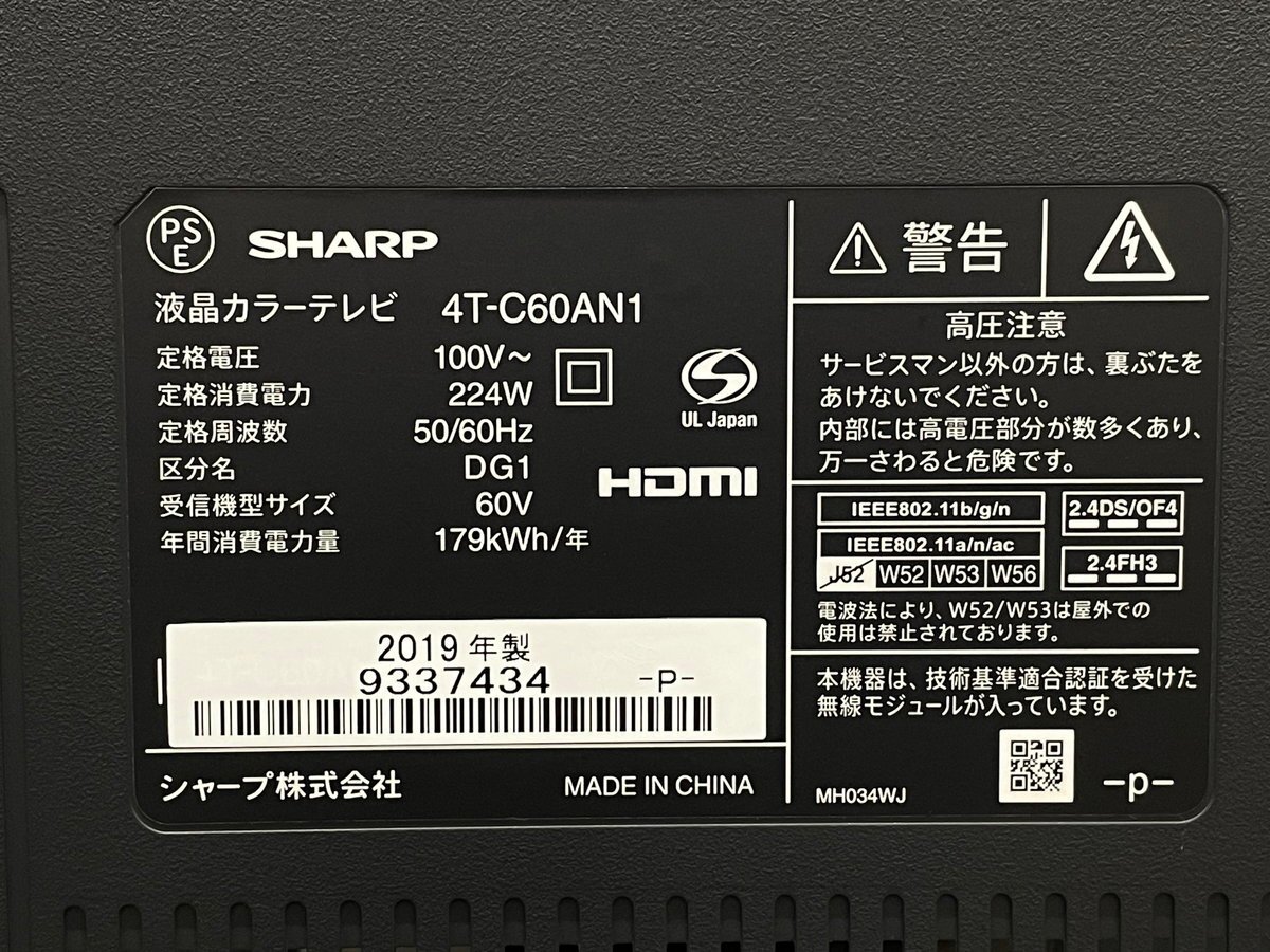 60インチ液晶4Kテレビ SHARP 4T-C60AN1(2019年製造)HDR/倍速駆動/Net動画 ■シャープ AQUOS★Joshin1332(ジャンク)●1円開始・直接引渡可