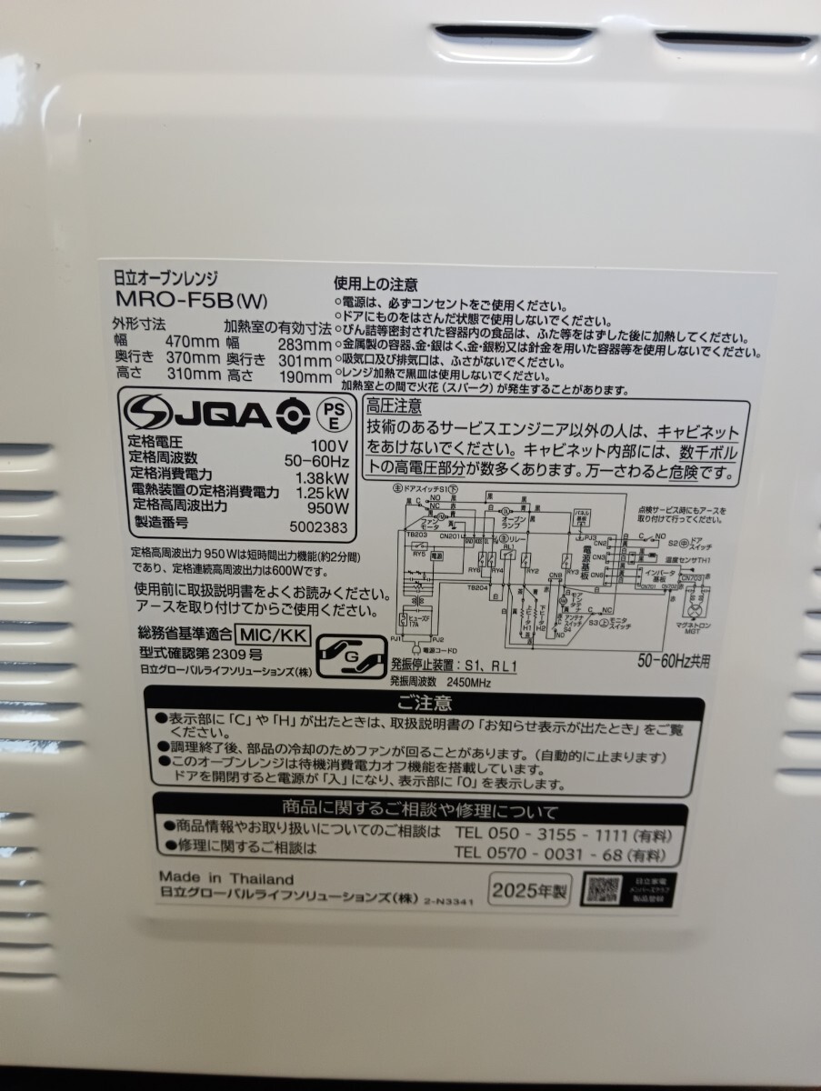 ・日立 オーブンレンジ HITACHI MRO-F5B W 2025年