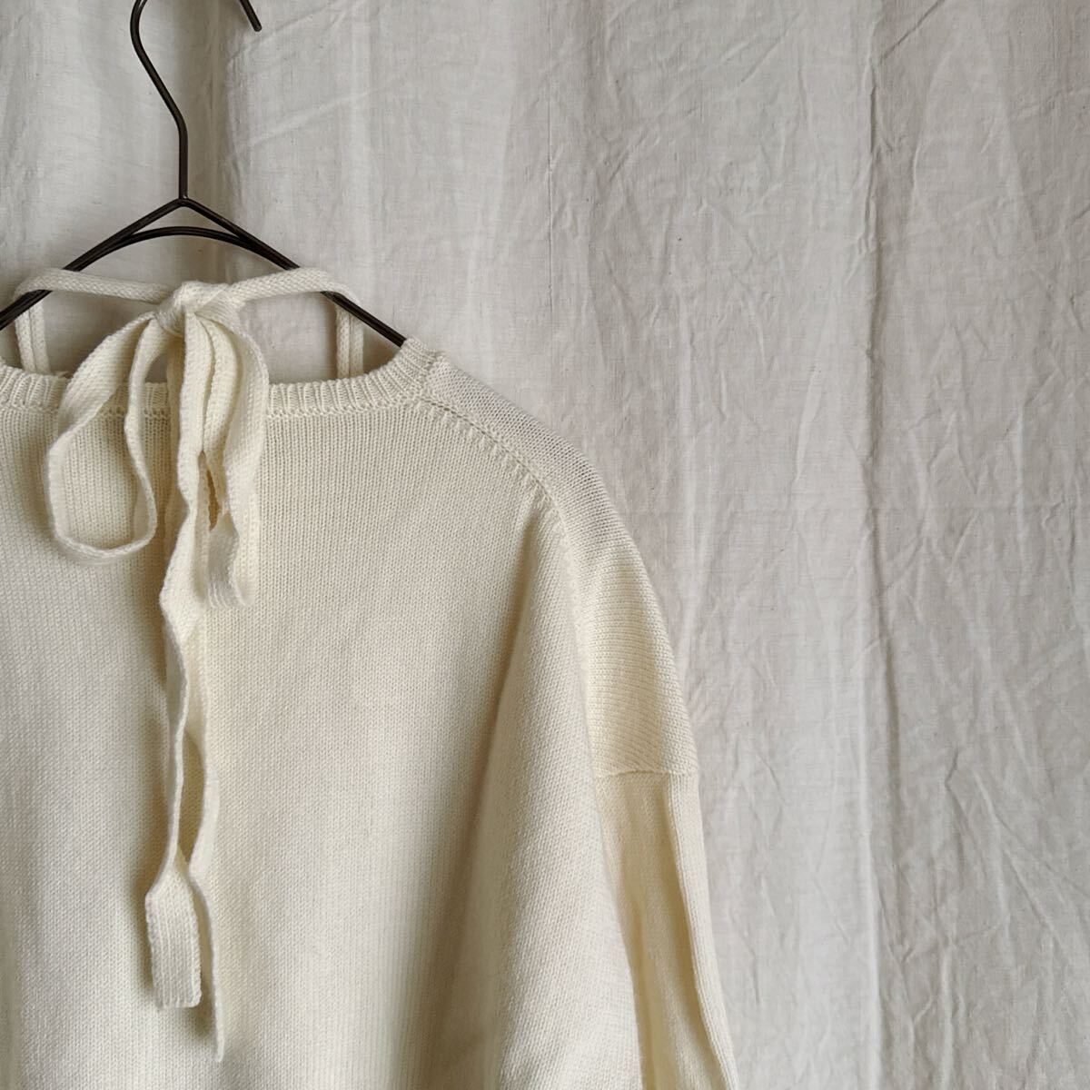 カラーはオフホワイトで、起毛がかったニット素材で、袖口&バック裾はリブ仕様です。