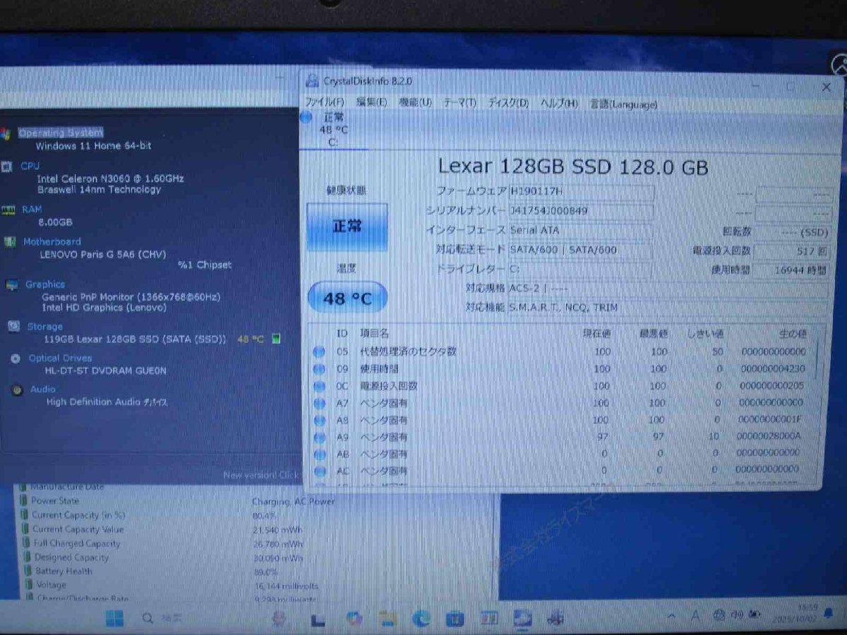 | バッテリー状態 | 新品時と比較して 89% の性能。 (BatteryInfoViewで表示された参考値であり実際の容量・充電可否は保証対象外) |