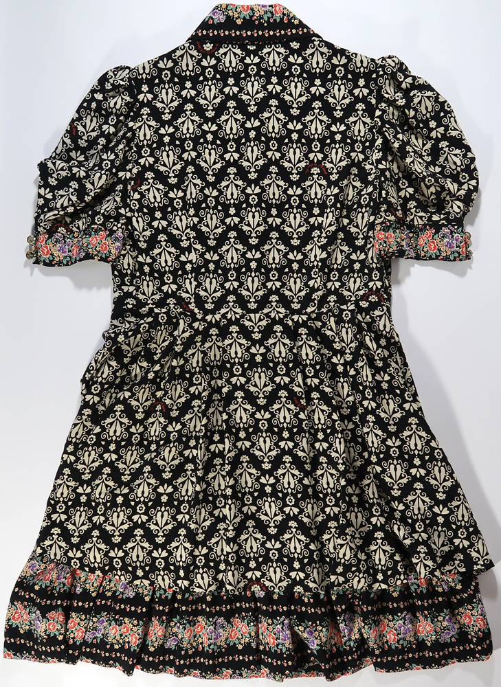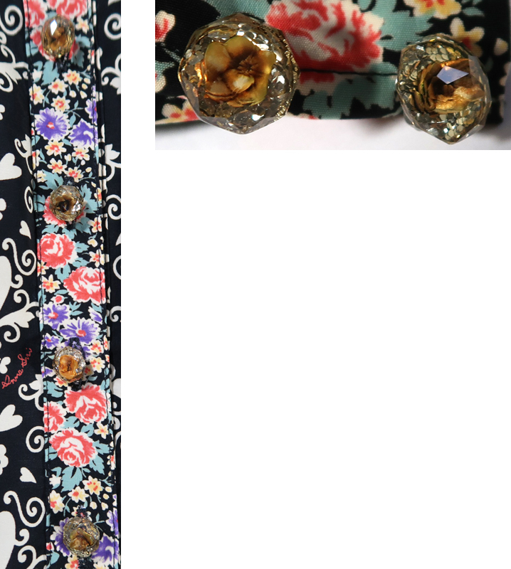 使用品ですので多少の汚れや擦れはるかと思います。私が見る限りはひどい傷や目立つような汚れは無かったです。クリアーボタンの中はたぶんドライフラワーが入っているような感じですが、本当の花かわかりません。生地は表地がポリエステル100%、裏地もポリエステル100%です。サイズは着丈が83cmくらい、肩幅は32cmくらい、身幅は43cmくらいです。袖丈は32cmくらいです。型の部分に膨らみがあるので肩幅や袖丈は正確ではないです。ベルトの長さは160cm位です。