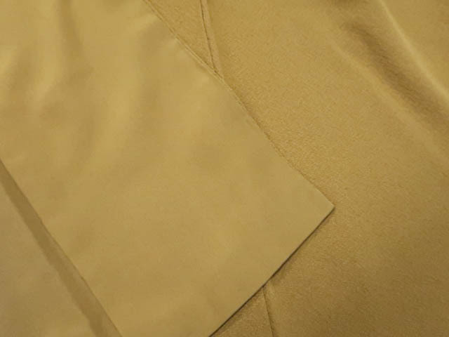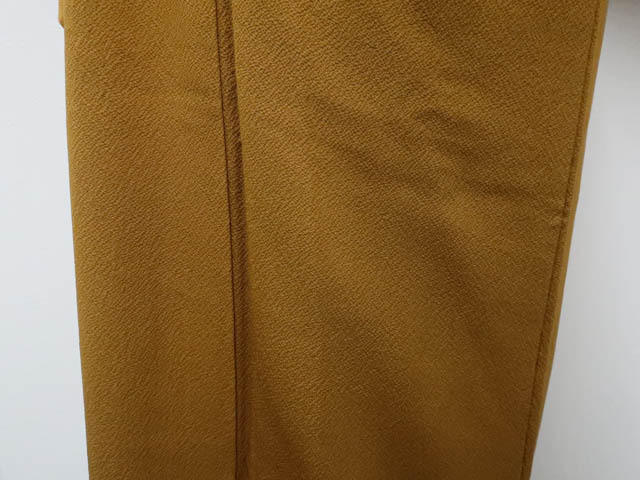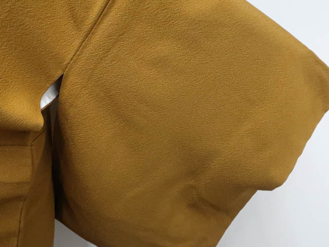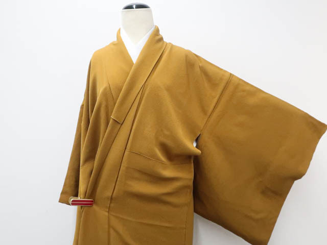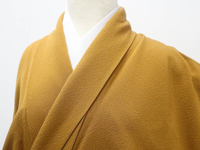 リサイクル商品のため、胴裏に点シミがございますがご着用いただけると存じます。 地色は黄土色です。 1枚目の画像が近いお色かと思われます。 素材は正絹です。 |