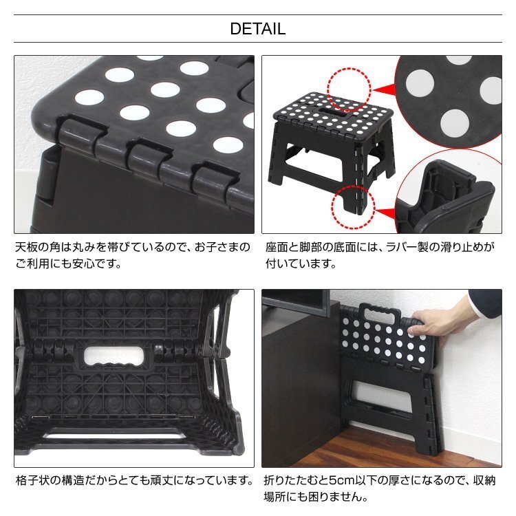 踏み台や折りたたみの椅子として、おうちに1台あると、とってもお役立ちのスツールです。 耐荷重は90kgまでなので、もちろん、大人の方が乗っても安心。 キッチンにて高いところのものを取ったり、玄関にて靴をはくときにちょっと腰掛けたり、野外に持ちだしてキャンプやスポーツのときの椅子としても活用できます。 洗車をする時の踏み台として、車に常備しておくのもお勧め。 用途はまだまだたくさんありそう、あなたの生活スタイルにあわせて、スツールをご活用ください。 折りたたむとカバンのようなカタチになるので、持ち運びもラクラク。 簡単に組み立てることができるので、お子様でも簡単に折りたたむことができます。 【商品詳細】 カラー:ブラック サイズ ・使用時:(約)幅31.5cm×奥行25cm×高さ22cm ・折りたたみ時:(約)幅31.5cm×奥行4cm×高さ35cm 重量:(約)1.5kg 耐荷重:(約)90kg 素材:ポリプロピレン、EVA ※転倒やケガにつながる恐れがありますので必ず、平坦な場所でのみご使用ください。 ※折りたたみ時に各部に手を挟まないよう、十分にご注意ください。 ※商品を使用して発生した事故・トラブル・破損等につきましては一切の責任を負いかねます。 |