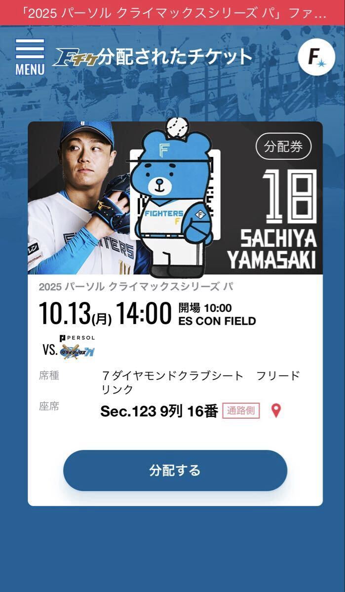 10月13日北海道日本ハムファイターズVSオリックスバファローズのダイヤモンドクラブシート席ペアチケット2枚連番チケットです。