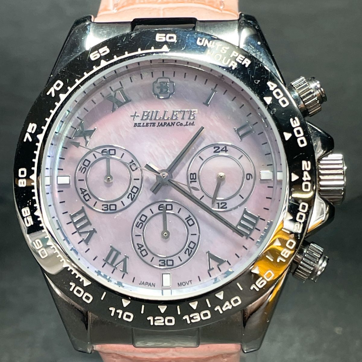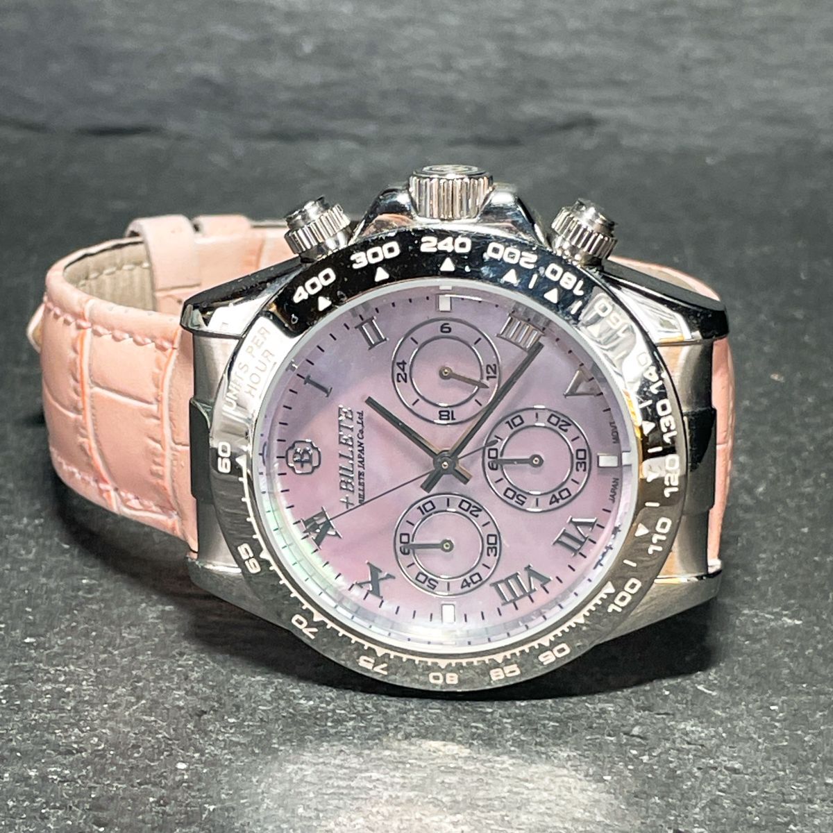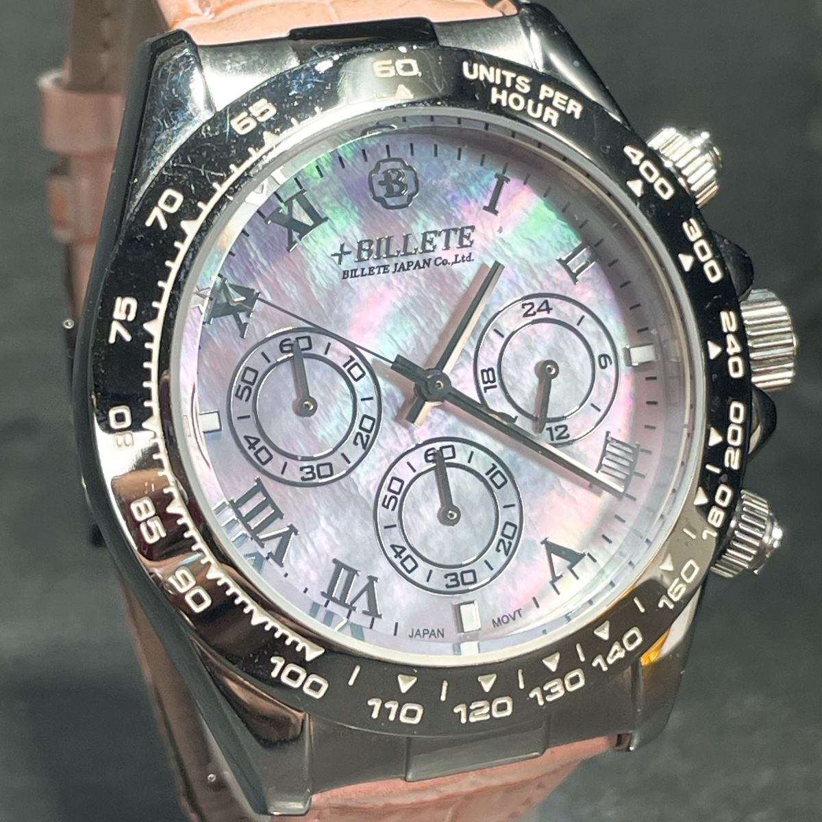 美品 +BILLETE ビレット 腕時計 アナログ クオーツ シェル文字盤 クロノグラフ レザーバンド ピンク 新品電池交換済み 動作確認済み