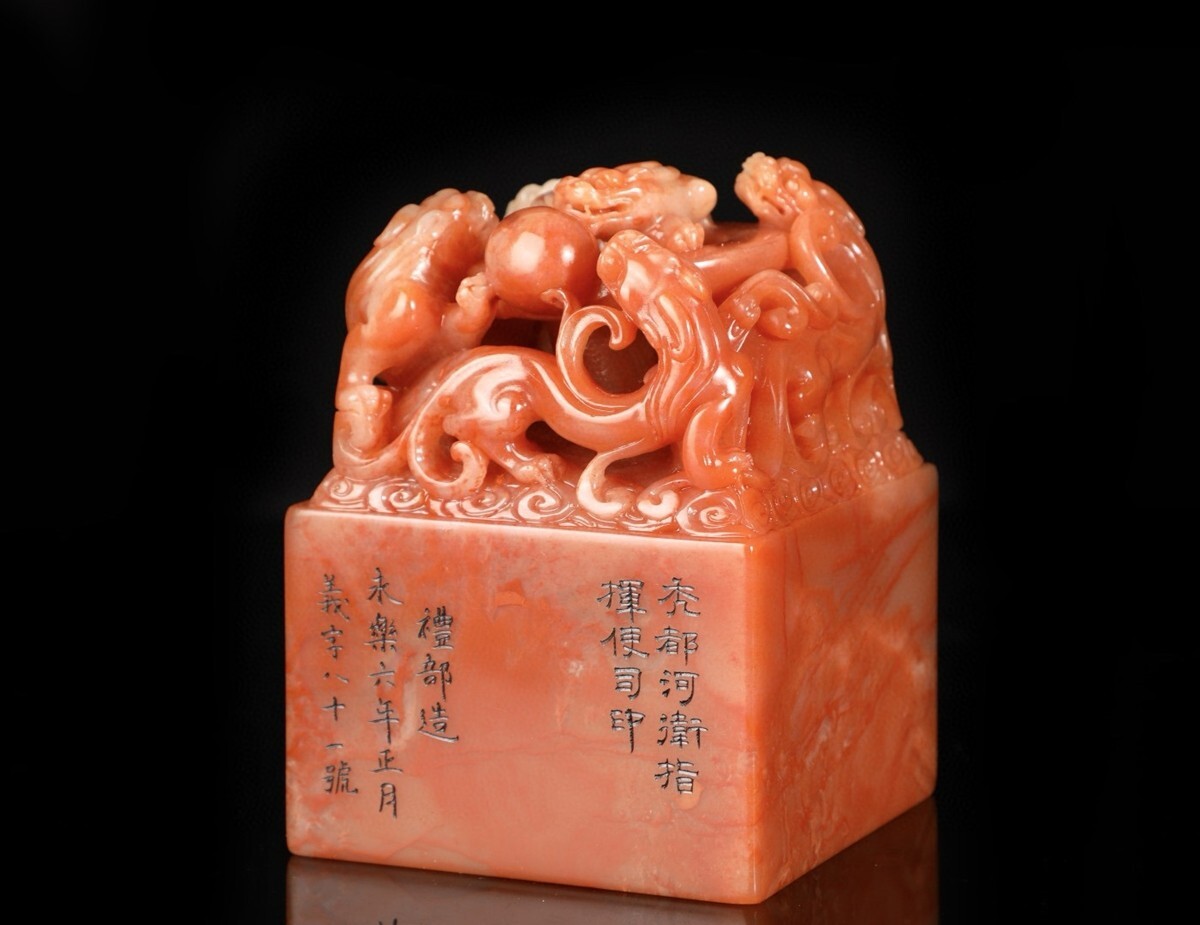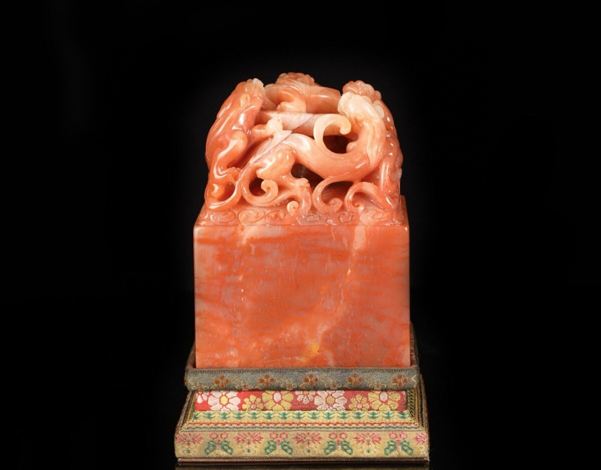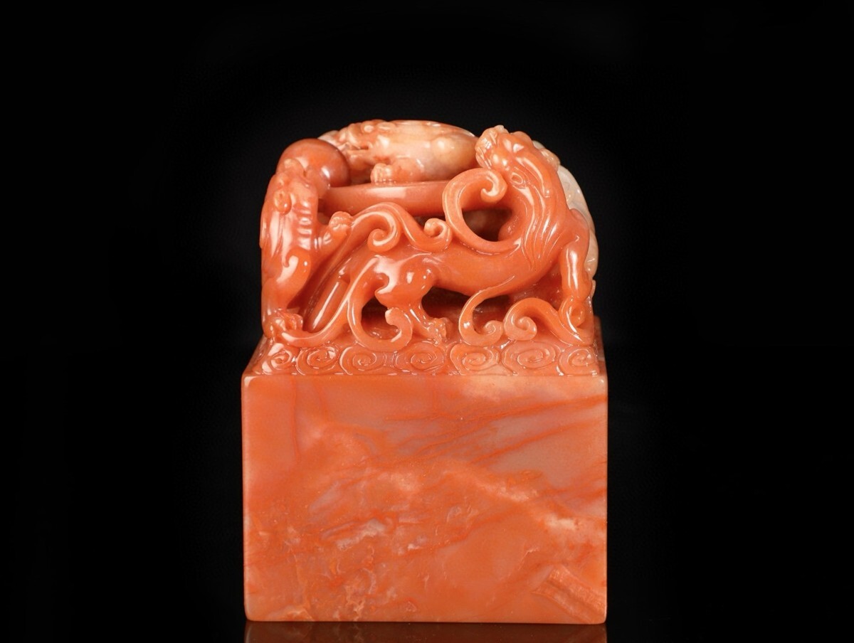 【瓏】寿山石 紅田黄石彫 魑龍戲珠印章 明代 禮部造 極細工 手彫り 置物擺件 中国古賞物 古美術 蔵出