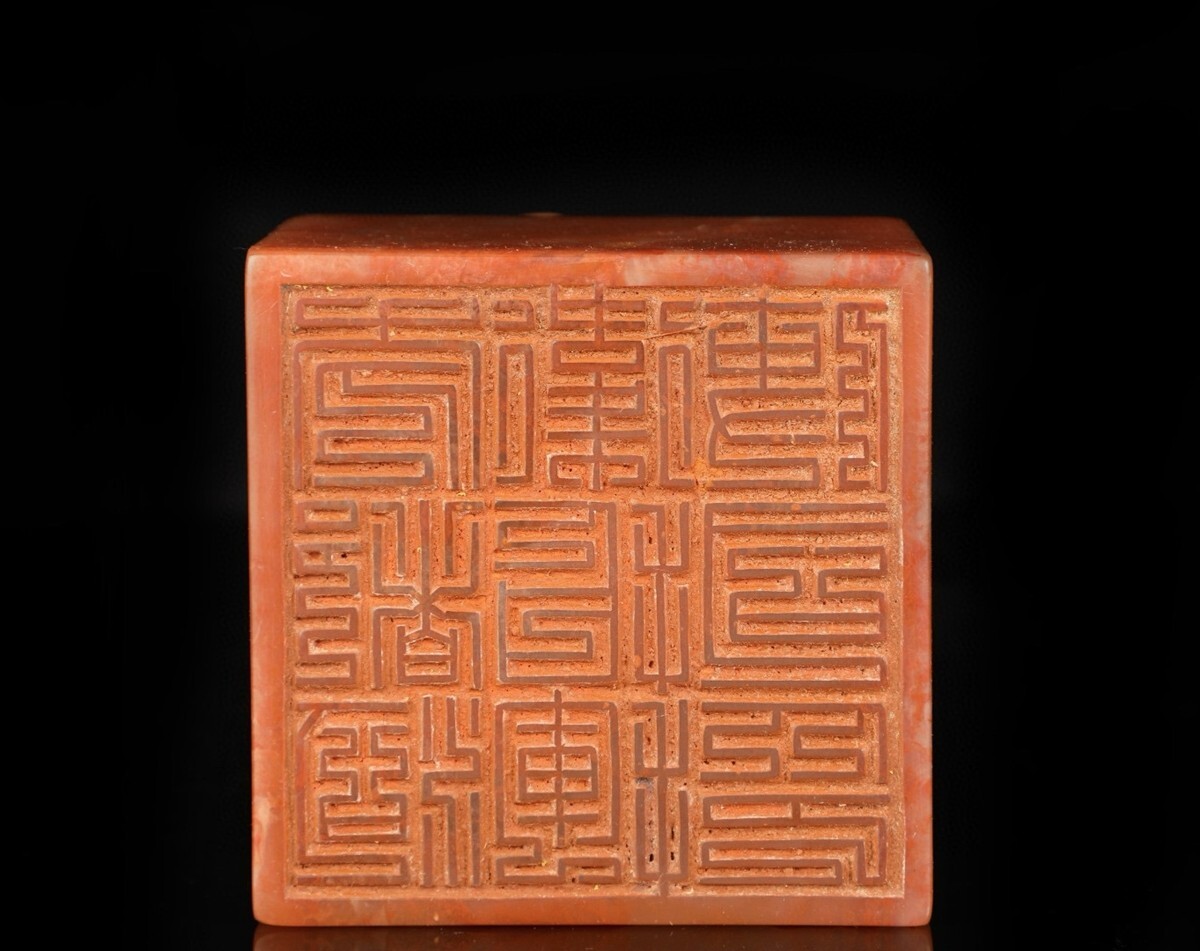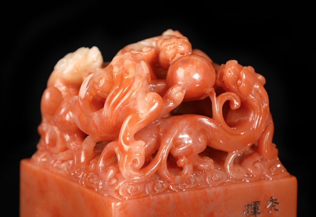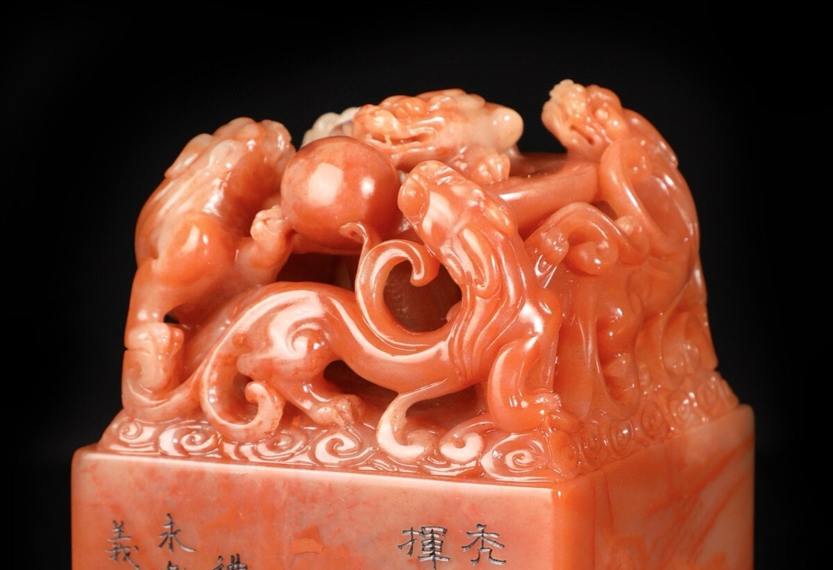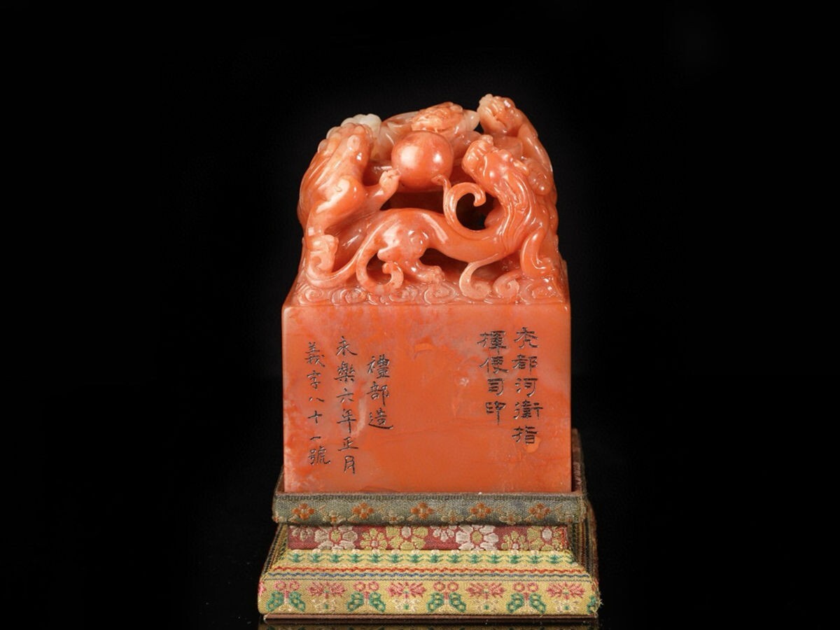 【瓏】寿山石 紅田黄石彫 魑龍戲珠印章 明代 禮部造 極細工 手彫り 置物擺件 中国古賞物 古美術 蔵出