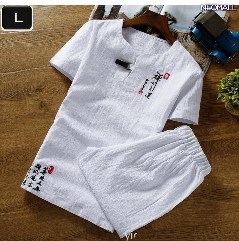 夏にピッタリ!☆【299】 新品 サマーコットン ヘンリーネック セットアップ ホワイト Lサイズ 春 夏 部屋着 ルームウエア