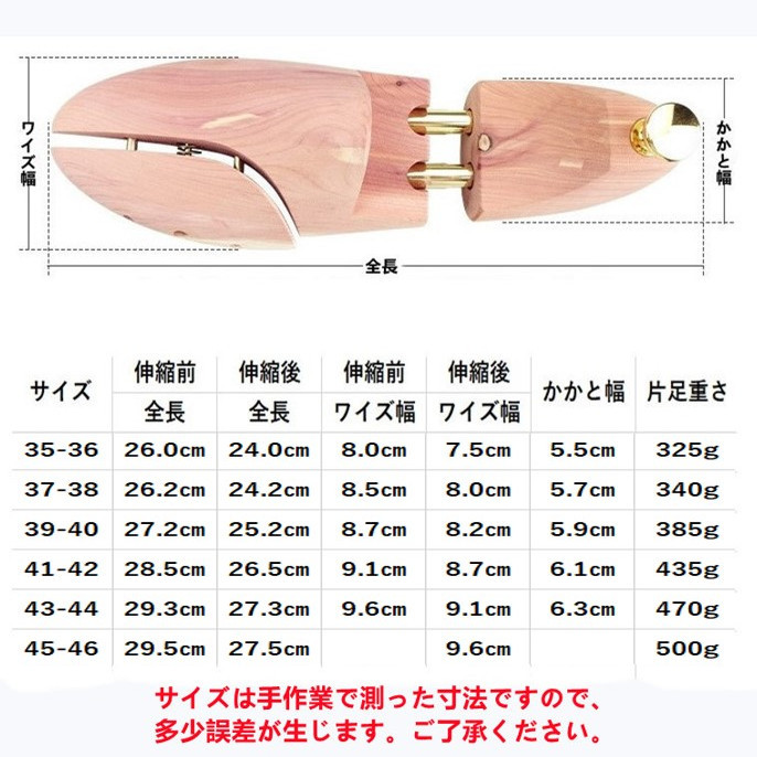 | ※サイズ表を確認してから、ご購入よろしくお願いします。 ※サイズが合わなかった場合、交換を承り致します。 ※1点ごとに職人が作っていますので、 細かいキズや補修の跡が見受けられる場合があります。 ※おまけですが、1足につき、 1セット(靴ブラシ&サンドペーパー)差し上げます。 レッドシダーシューキーパーです。 職人が1点1点手作りし、あなたの大切な 靴を型崩れから守ってくれます。 木のそのままの素材を生かしています。 ニスが塗ってあるシューキーパーですと、 靴を脱いですぐに入れるとカビが はえてしまう事がありますが、 木のそのままの素材を生かしているため、 靴を脱いですぐに入れても大丈夫です。 「シューキーパー」?という方もいらっしゃるかも しれませんので、簡単に説明させて頂きますと、 脱いだ靴をそのままにし、型崩れを起こすと、 革の耐久性が非常に落ちます。 クリームを塗ればある程度は持ちますが、 このシューキーパーを使っている靴と 使っていない靴とでは、使用出来る期間が全く違います。 私もそう感じますし、ネットで検索すると、 実験している方もいます。 そのような、効果がある商品です。 細かいサイズ調整は、スプリング式なので、 靴の型崩れが起きにくく、綺麗な状態で保管出来ます。 スプリング式なので、伸縮し内面から靴の 型崩れを防止します。 素材:レッドシダー レッドシダーシューキーパー5大効果 1、靴ジワを伸ばし 2、形崩れ防止 3、除湿・乾燥 4、脱臭・消臭 5、防虫 是非、一度ご利用してみませんか? 大切なお客様へ 商品ご覧頂き、誠に有難うございます。 落札者様のご要望にお答えできるように頑張ります。 お急ぎの方、領収証ご希望の方などは、質問欄や 取引ナビにてご連絡下さい。 多数商品落札頂いた場合、同梱はほぼすべての商品が可能です。 (一部非対応有) 是非、送料節約にご利用下さい。 定形外発送等の追跡、補償がない発送の場合、郵便物の不着、 商品の補償は出来かねますので、何卒ご了承下さい。 不安な方は、ゆうパック発送等をお選び下さい。 多数落札後は、まとめ依頼申請か取引ナビにて必ず落札商品すべてを ご連絡下さい。ご連絡がありませんと、同梱出来ない 場合があります。 また、落札後のご連絡は、落札後にヤフーから届くメールの内容を 確認して頂き、取引ナビにてその内容をご連絡下さいませ。 土日祭日はお休みを頂いております。 何卒、ご了承下さい。 迅速で、気持ちの良いお取引を心掛けます! 皆様のご入札お待ちしております。 | ||