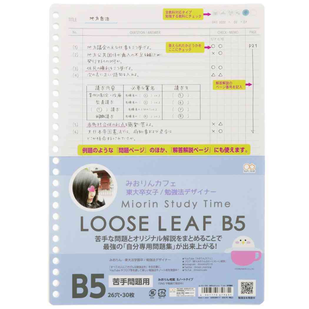 みおりん Study Time ルーズリーフ 26穴 B5 学習ノート 苦手問題用 プレゼント 男の子 女の子 ギフト バレンタイ