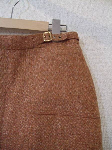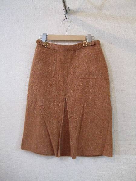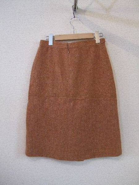 | 商品紹介 | オレンジがかった茶のツイードがオシャレなスカートです。 ボックスプリーツのやや台形方のラインでスッキリ上品な印象です。 表からは見えませんが、植物をモチーフにしたシルク素材の裏地が付いています。 素材:毛90% 絹10% 裏地:絹100% |