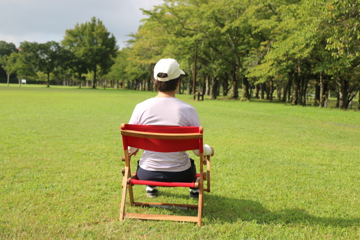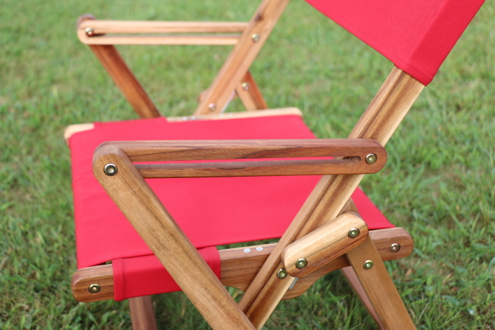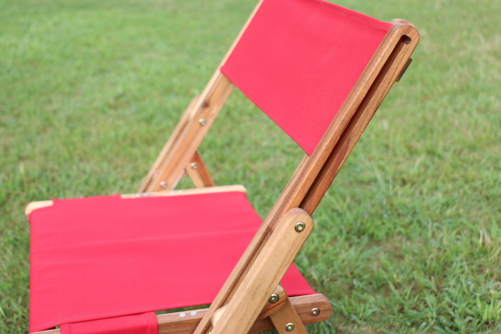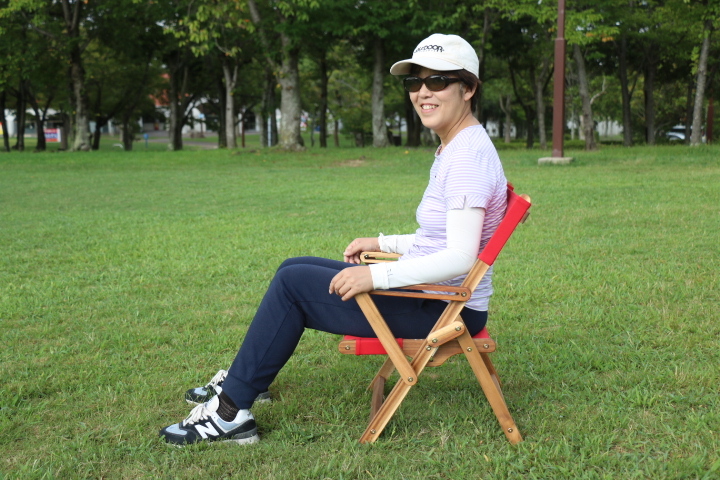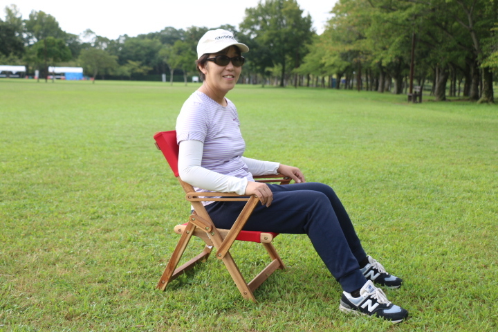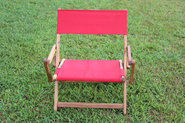 アカシアの木肌がチーク材のように素敵です。座面が低いのでキャンプ場でもゆったりと落ち着きますし